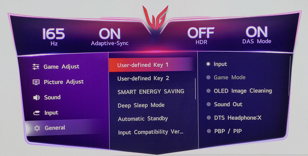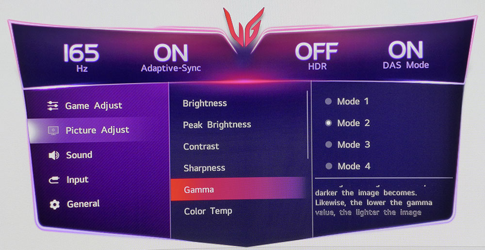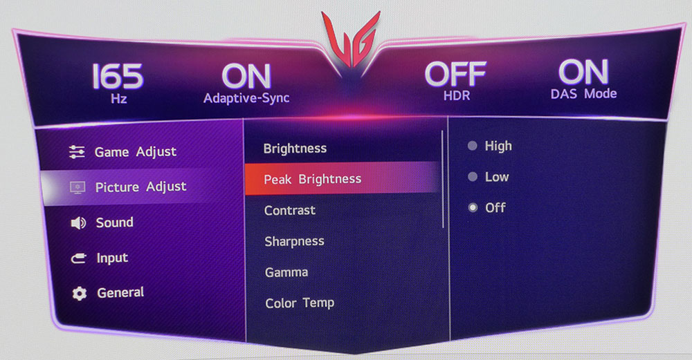 LG Ultra Gear 45GX950A автоматически переключается в режим HDR при подаче сигнала HDR10. При этом доступны шесть режимов изображения, а также регулировка яркости и пиковой яркости.