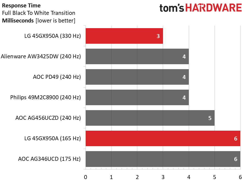 LG Ultra Gear 45GX950A перемещает большое количество пикселей, поэтому частота 165 Гц вполне достаточна для экрана с более чем 11 миллионами точек. Время отрисовки 6 мс достаточно для того, чтобы предотвратить размытие при движении. Помните, что OLED-дисплеи более плавные при заданной частоте обновления, чем ЖК-дисплеи, и не используют овердрайв или стробинг. Тем не менее при частоте ниже 200 Гц наблюдается небольшое размытие. При частоте 330 Гц, когда время отрисовки сокращается до 3 мс, размытия не наблюдается.