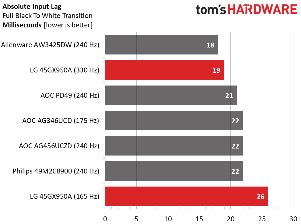 Задержка ввода данных приемлемая, но не критичная. 26 мс — это достаточно быстро для большинства игроков, а также для симуляторов вождения или полётов. Однако лучшие геймеры могут заметить это в динамичных шутерах. При переключении на 330 Гц задержка снижается до приемлемых для соревнований 19 мс. Единственный недостаток — плотность пикселей падает до 63 ppi.