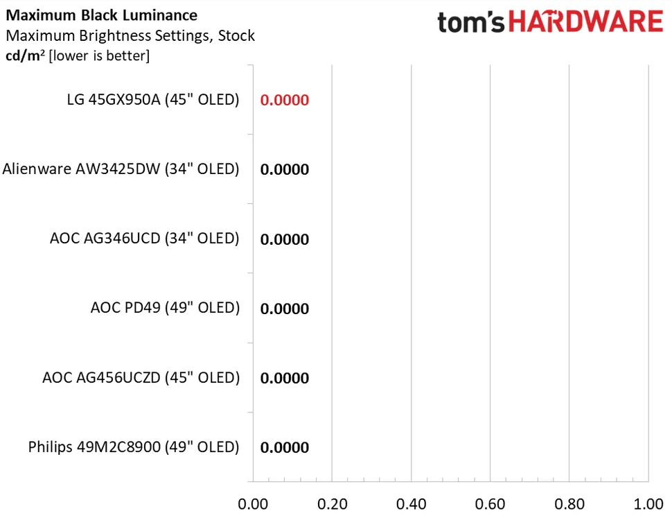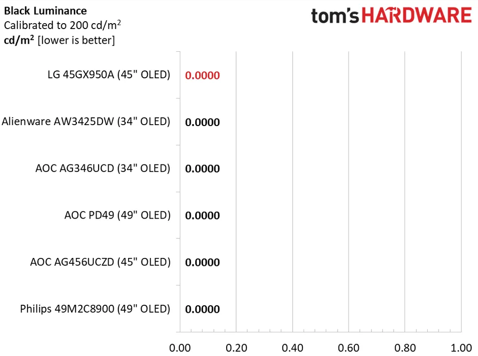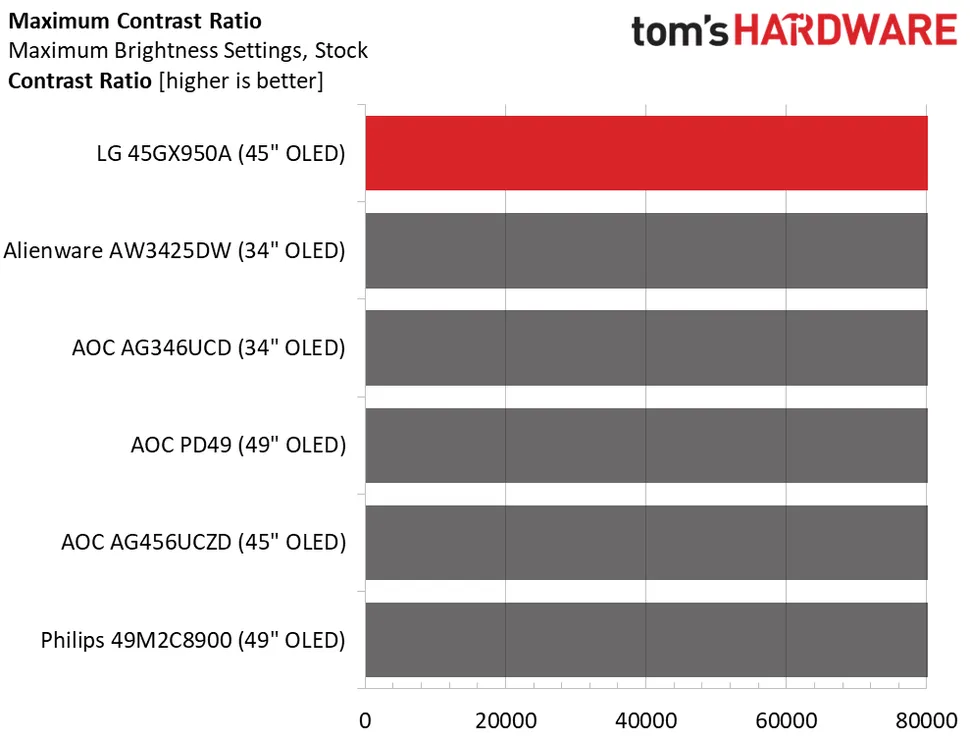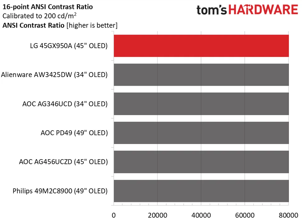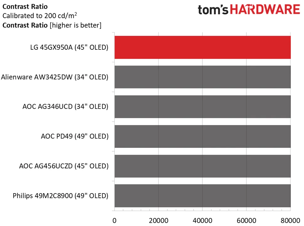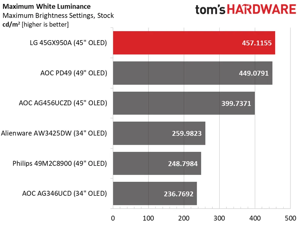 45GX950A очень яркий, особенно учитывая его большой размер. Для достижения этой цели он потребляет немного больше мощности, чем его конкуренты, но оно того стоит, учитывая 457 нит SDR-контента. Это максимальное значение, для параметра Пиковая яркость установлено значение high. Если отключить PB (переменная яркость), пиковое значение составит около 285 нит. Как и во всех OLED-дисплеях, уровень черного и контрастность измерить невозможно.