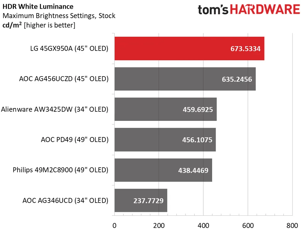 Я измерил яркость на 25 % площади экрана при максимальной яркости и получил значение 673 нита. Заявленная LG яркость в 1300 нит на 1,5 % площади экрана не вызывает сомнений. Это очень яркий монитор, и его яркость усиливается за счёт размера. Если вы играете в тёмном помещении, возможно, вам придётся регулировать яркость. Лишь немногие мониторы позволяют настраивать HDR, но 45GX950A позволяет. Я рекомендую высокую пиковую яркость для всего HDR-контента, но если вам кажется, что изображение слишком яркое, вы можете снизить яркость до минимума или отключить эту функцию. Уровень чёрного и контрастность не поддаются измерению. Это отличная производительность.