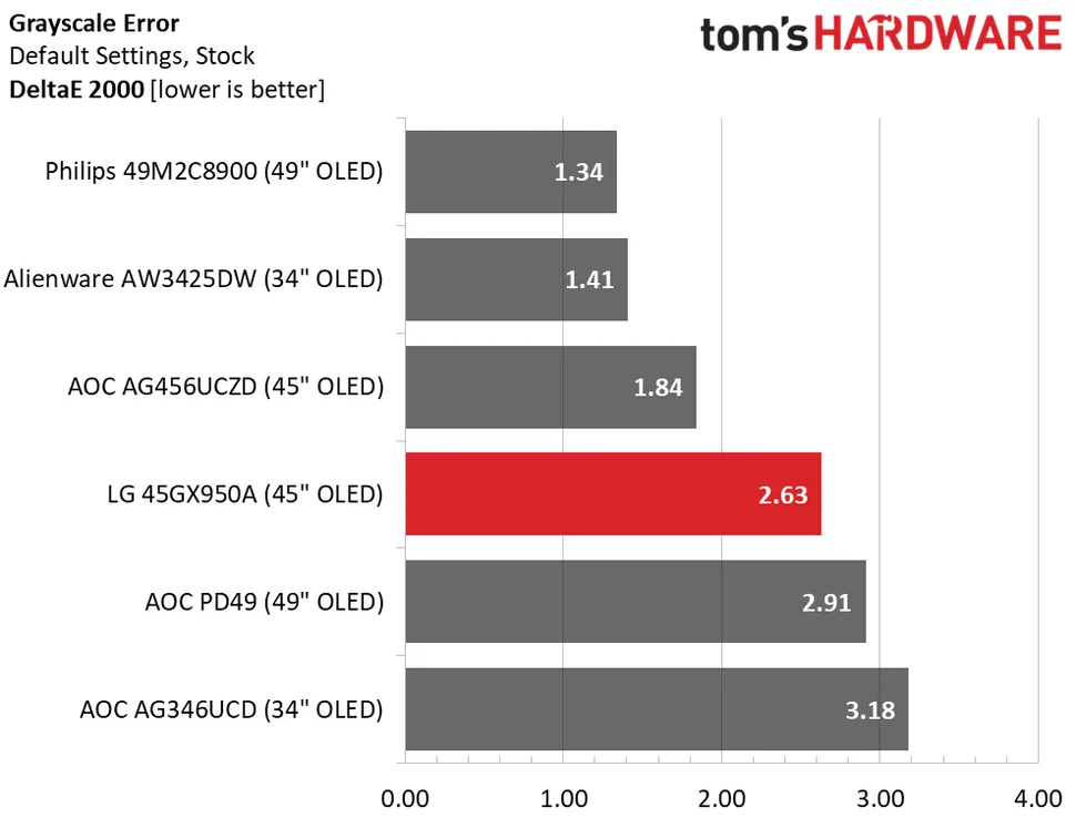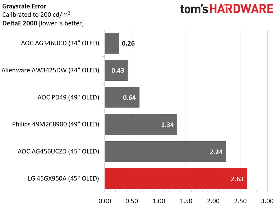 LG Ultra Gear 45GX950A выгодно отличается от своих конкурентов показателем серого цвета 2,63dE без калибровки. Им можно пользоваться без калибровки. Поскольку мне не удалось улучшить этот показатель, после настройки других экранов он оказался на последнем месте. На нём почти нет видимых ошибок, так что я не могу на него пожаловаться.