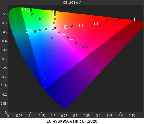 Цвета в режиме HDR обычно перенасыщены на 5–15 %. Это типично для протестированных мной HDR-мониторов. Во всём HDR-контенте много контраста, и у меня никогда не возникало проблем с прорисовкой мелких деталей. Это отличная производительность. В таблице BT.2020 у 45GX950A насыщенность красного цвета составляет 85 %, зелёного — 70 %, а синего — 95 %.