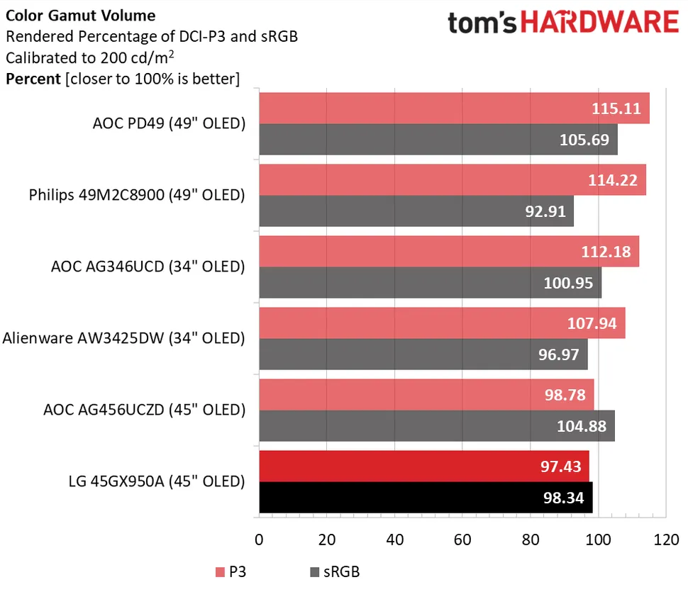 В тесте на объём вы можете видеть, что у 45GX950A нет слоя с квантовыми точками, что ставит его в один ряд с AG456UCZD и ставит ниже четырёх верхних экранов, которые более насыщенные. Тем не менее 97,43 % DCI-P3 — это очень красочно. Я заметил некоторую перенасыщенность в режиме sRGB, но итоговый расчёт объёма составил идеальные 98,34 %.
