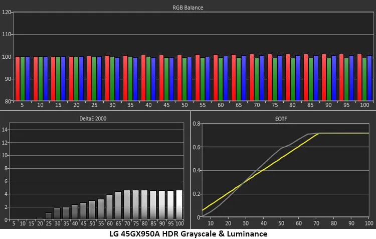 LG Ultra Gear 45GX950A демонстрирует слегка тёплую градацию серого с большинством ошибок в пределах 4dE или меньше. Это простительно, поскольку красные ошибки менее заметны, чем зелёные или синие. Отслеживание EOTF немного затемнено от нуля до 30 %, а затем выходит за пределы линии до перехода тональной карты на уровне яркости 70 %. Я смог рассмотреть все мелкие детали в реальном контенте. Я заметил, что при более низких значениях пиковой яркости след опускается ниже эталонного уровня, из-за чего некоторые детали в тени становятся трудноразличимыми.