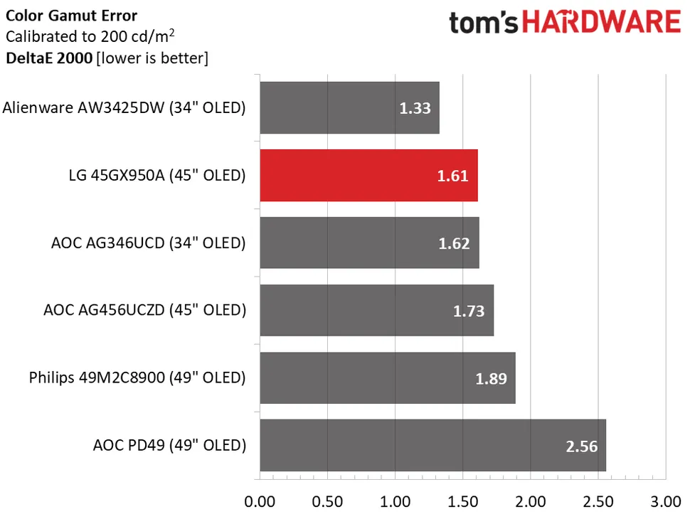 LG Ultra Gear 45GX950A занимает второе место в сравнении цветопередачи, несмотря на то, что работает с настройками по умолчанию. Все остальные экраны были откалиброваны, а это значит, что LG хорошо поработала над заводской настройкой. Это отличная производительность.
