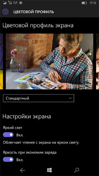 Несмотря на сложившуюся за годы репутацию технологии OLED, дисплей Lumia 950 XL практически на 100% соответствует стандарту sRGB без каких-либо дополнительных настроек, а цветовая температура соответствует 6500K. Впрочем, если то, как дисплей передает цвета, не соответствует вашим вкусам, в разделе «Цветовой профиль» можно переключаться между тремя предустановленными профилями или полностью настроить параметры экрана, включая цветовую температуру, оттенки и насыщенность цвета. Здесь же можно включить или выключить опцию Clear Black 2, которая заключается в избыточном завышении яркости и контраста дисплея в условиях яркого цвета. Напомню, что, помимо этого, дисплей традиционно для Nokia, а теперь и Microsoft имеет специальный поляризационный слой, позволяющий повысить читаемость информации на солнце за счет снижения числа бликов.