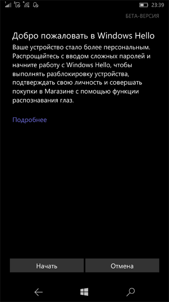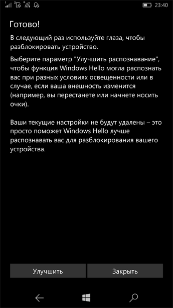При этом включается лампа инфракрасной подсветки, и в специальном окошке можно увидеть собственные глаза. Microsoft не раскрывает секретов работы системы, но, судя по всему, используется передняя камера в сочетании с лампой инфракрасной подсветки, а не самостоятельный сканер. Система пока имеет статус Beta, что означает признание определенных проблем в ее работе. Главная проблема в том, что иногда смартфон не распознает тебя на том расстоянии, на котором держишь устройство, и просит поднести его поближе. Тем не менее на результаты сканирования не влияет освещенность, а также наличие очков.
