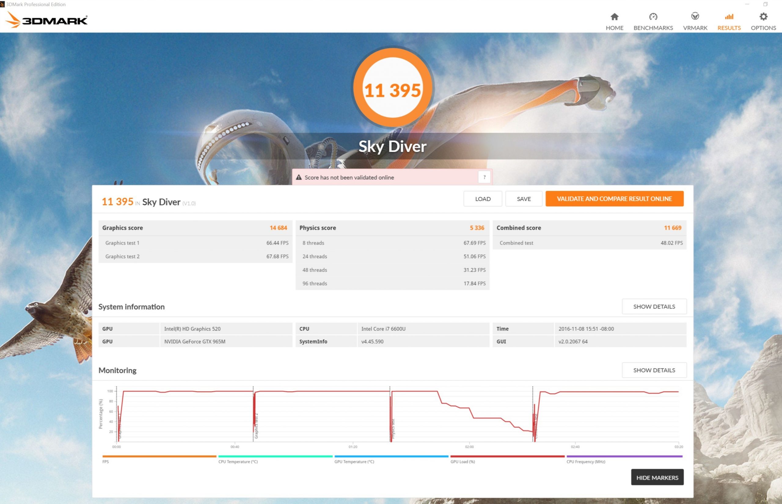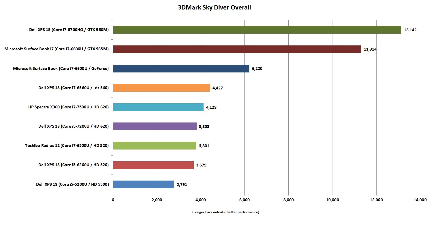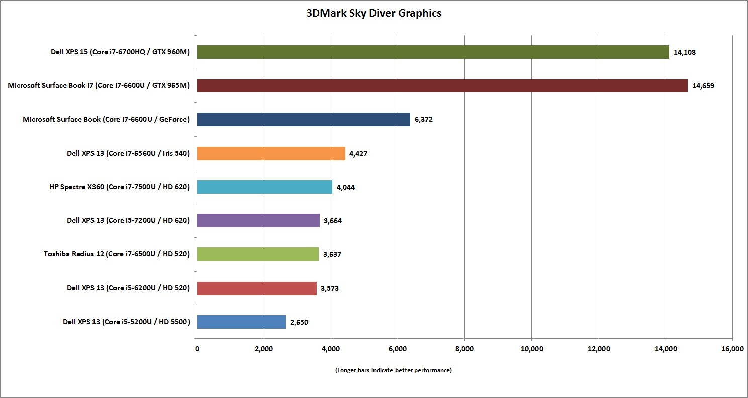 Синтетический тест 3DMark Sky Diver, разработанный Futuremark, оценивает производительность графической подсистемы ПК. Несмотря на то, что реальные движки видеоигр здесь не используются, тест относится к числу весьма показательных. Для сравнения я запустил его и на Dell XPS 15 – 15-дюймовом ноутбуке с четырехъядерным центральным процессором и графическими компонентами GeForce GTX 960M, который гораздо толще и крупнее. Поскольку общая оценка во многом зависит от количества процессорных ядер, XPS 15 одержал здесь верх.