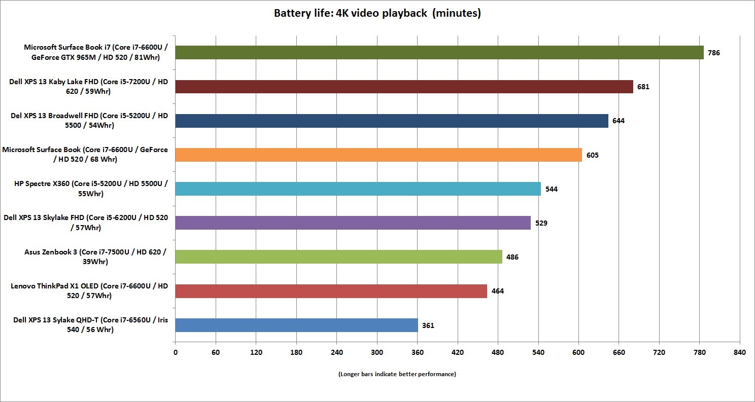 И что же в результате? Продолжительность работы от батареи оказалась долгой до неприличия. Воспроизведение фильма в течение 13 часов стало для нас новым рекордом. Оригинальный Surface Book проработал заслуживающие уважения 10 часов, а ближайший конкурент Dell XPS 13 выключился, едва перевалив за отметку в 11 часов.
