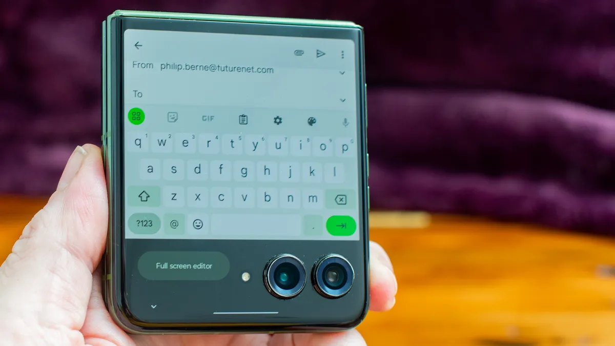 Все в дизайне смартфона все тщательно продумано, начиная с задней панели из веганской кожи (и как утверждает Motorola, что он не выцветает и не оставляет пятен) и заканчивая огромным внешним дисплеем, в котором объективы сдвоенных камер будто бы плавают. Складной внутренний дисплей выглядит настолько плоским, что вам придется хорошенько постараться, чтобы нащупать складку.