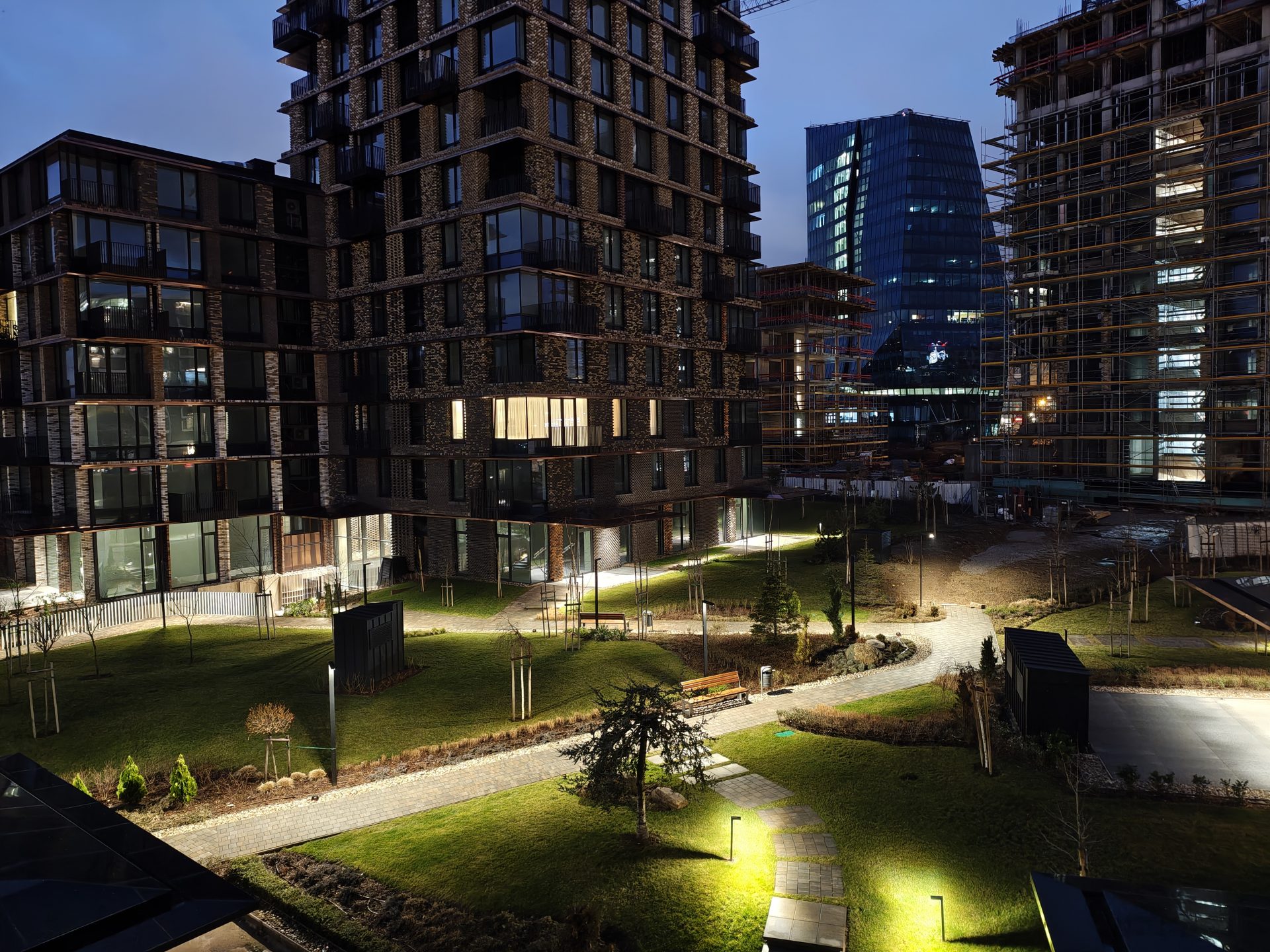 С наступлением ночи сверхширокоугольный модуль несколько теряет ту отточенность, которую демонстрировал днем, но остается вполне компетентным. У него очень хороший динамический диапазон, точный баланс белого с нормальным уровнем насыщенности и достойная детализация, если не вглядываться в относительно мягкие тени.