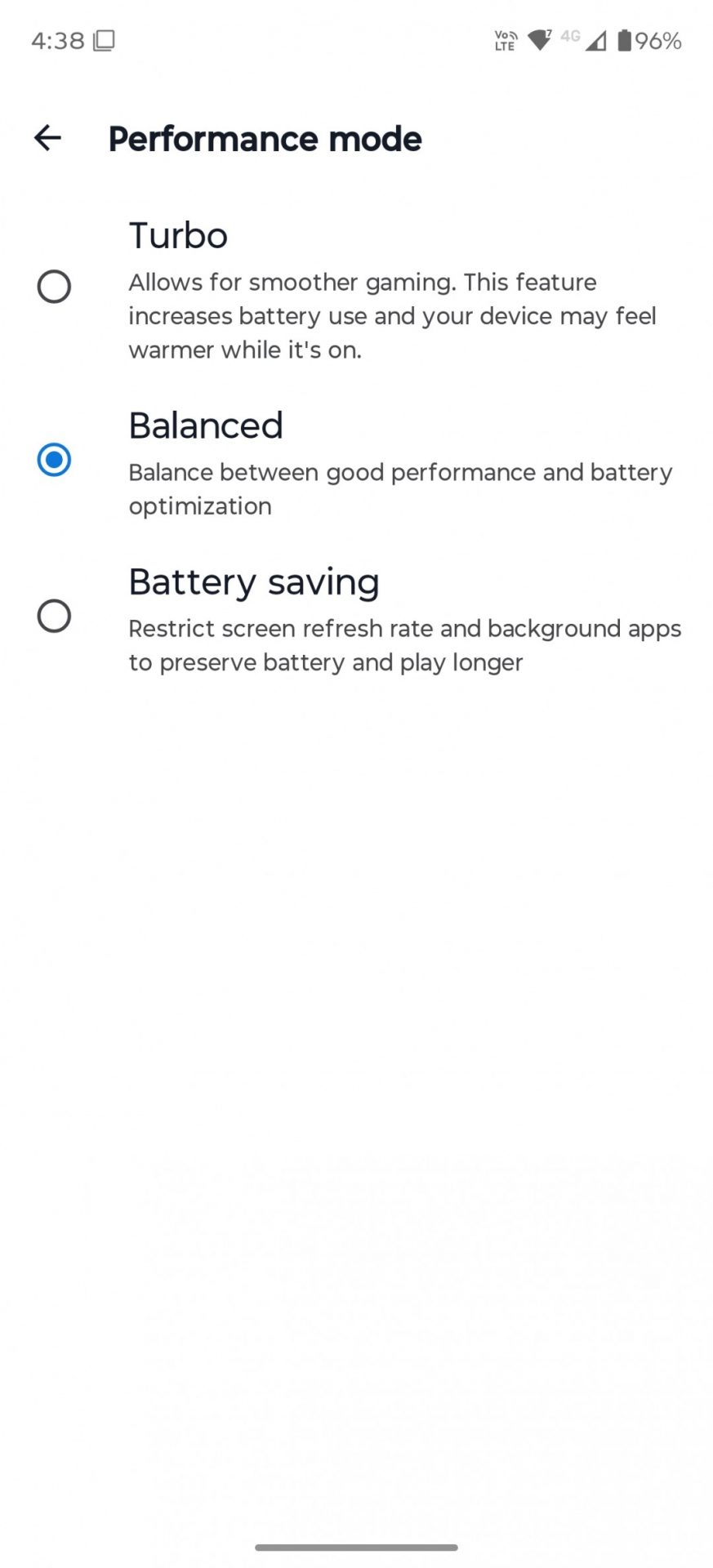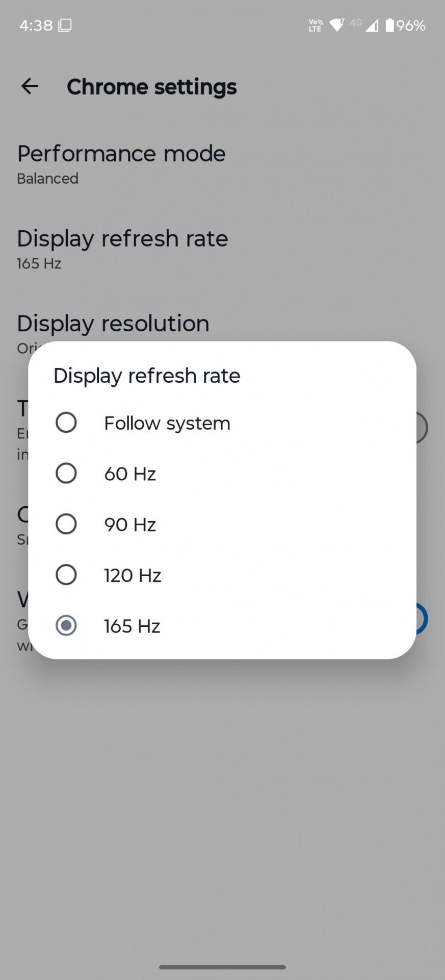 Благодаря технологии LTPO дисплей умеет динамически менять частоту обновления от 0 до 165 Гц. В настройках доступны три режима: «Smart & Balanced» (Умный и сбалансированный), «Hyper smooth» (Гиперплавный) и «Efficiency first» (Приоритет энергосбережения). Последний ограничивает частоту 60 герцами и снижает её до 0 Гц, когда на экране статика. Режим по умолчанию («Smart & Balanced») и режим «Hyper Smooth» автоматически регулируют частоту до 120 Гц. Разница лишь в том, что «Hyper Smooth» старается удерживать высокую частоту чаще.