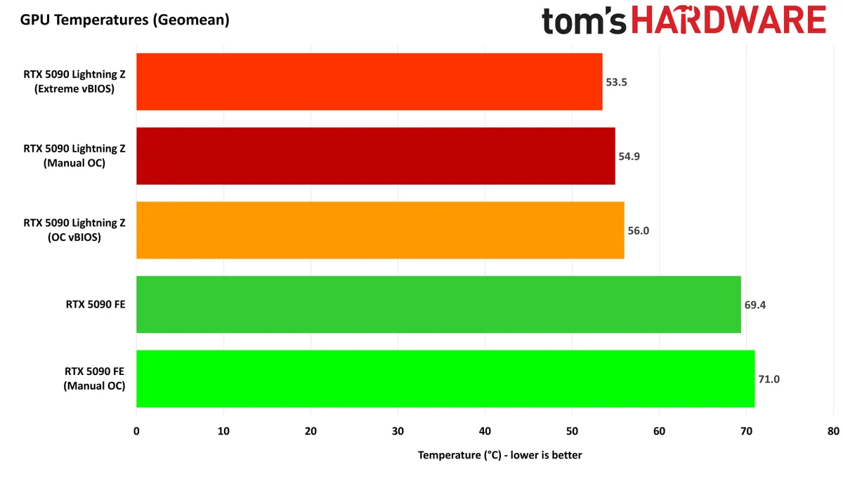 Эти сводные результаты также отлично показывают, насколько круто справляется со своей задачей кастомное жидкостное охлаждение от MSI. Даже с учетом того, что карте приходится рассеивать на 25–30% больше тепла, массивный радиатор удерживает температуру чипа GB202 на целых 16 градусов ниже, чем у Founders Edition. Да, это вполне ожидаемо, ведь у референсной платы стоит куда более скромный воздушный кулер, но результат все равно вызывает уважение.