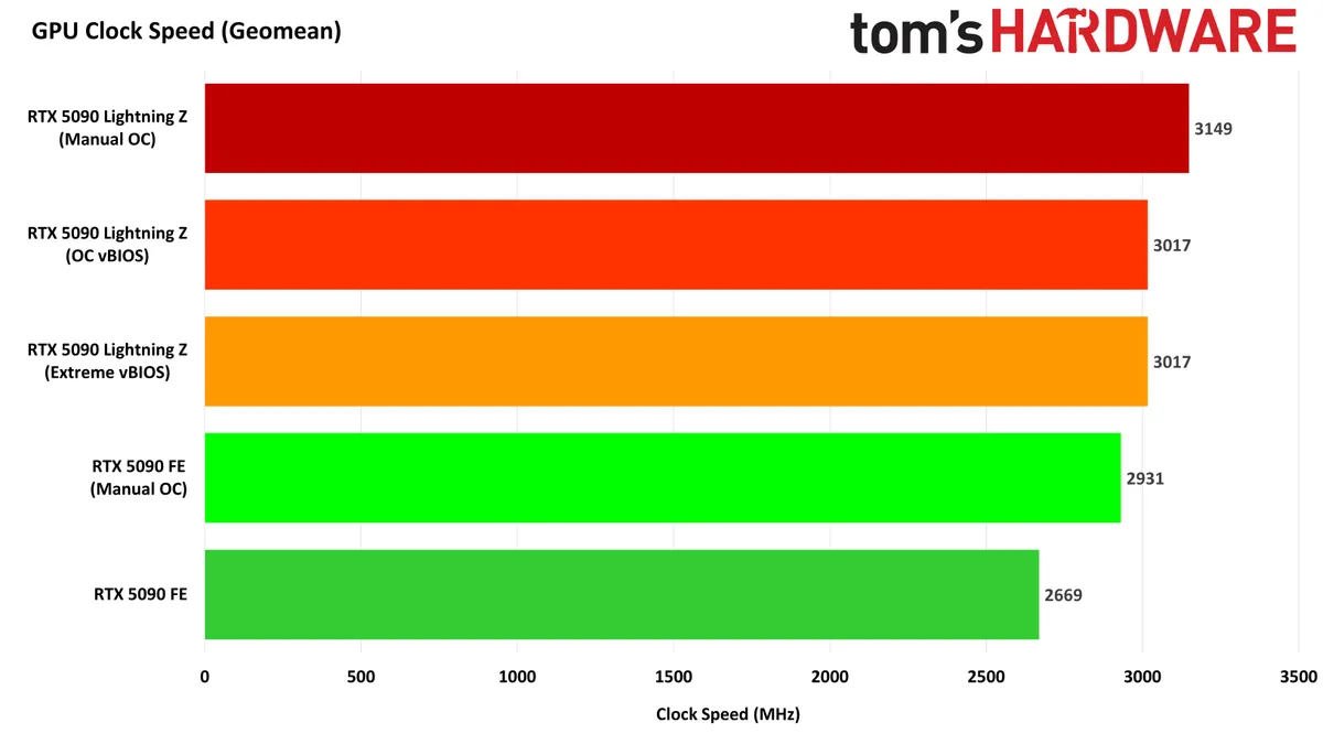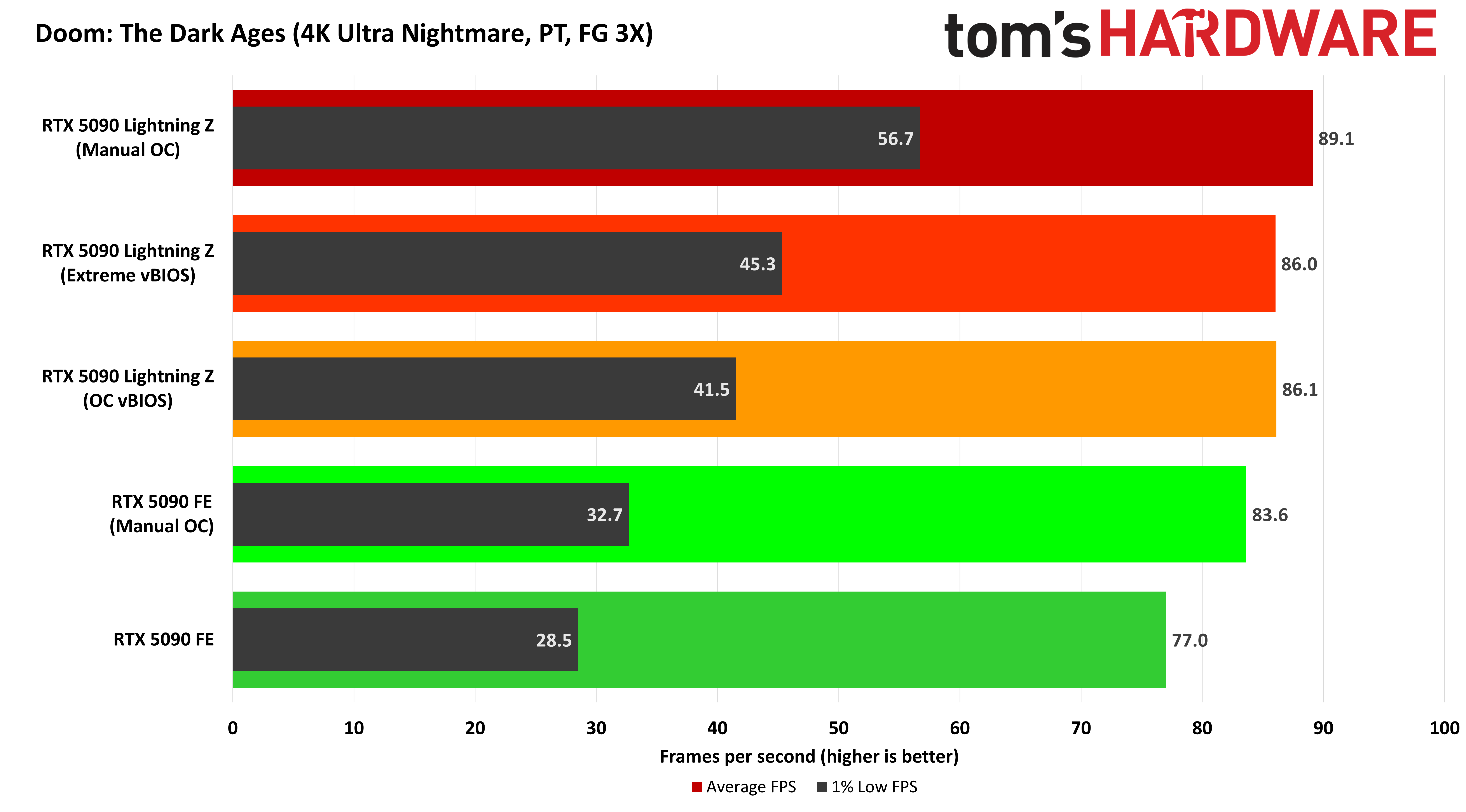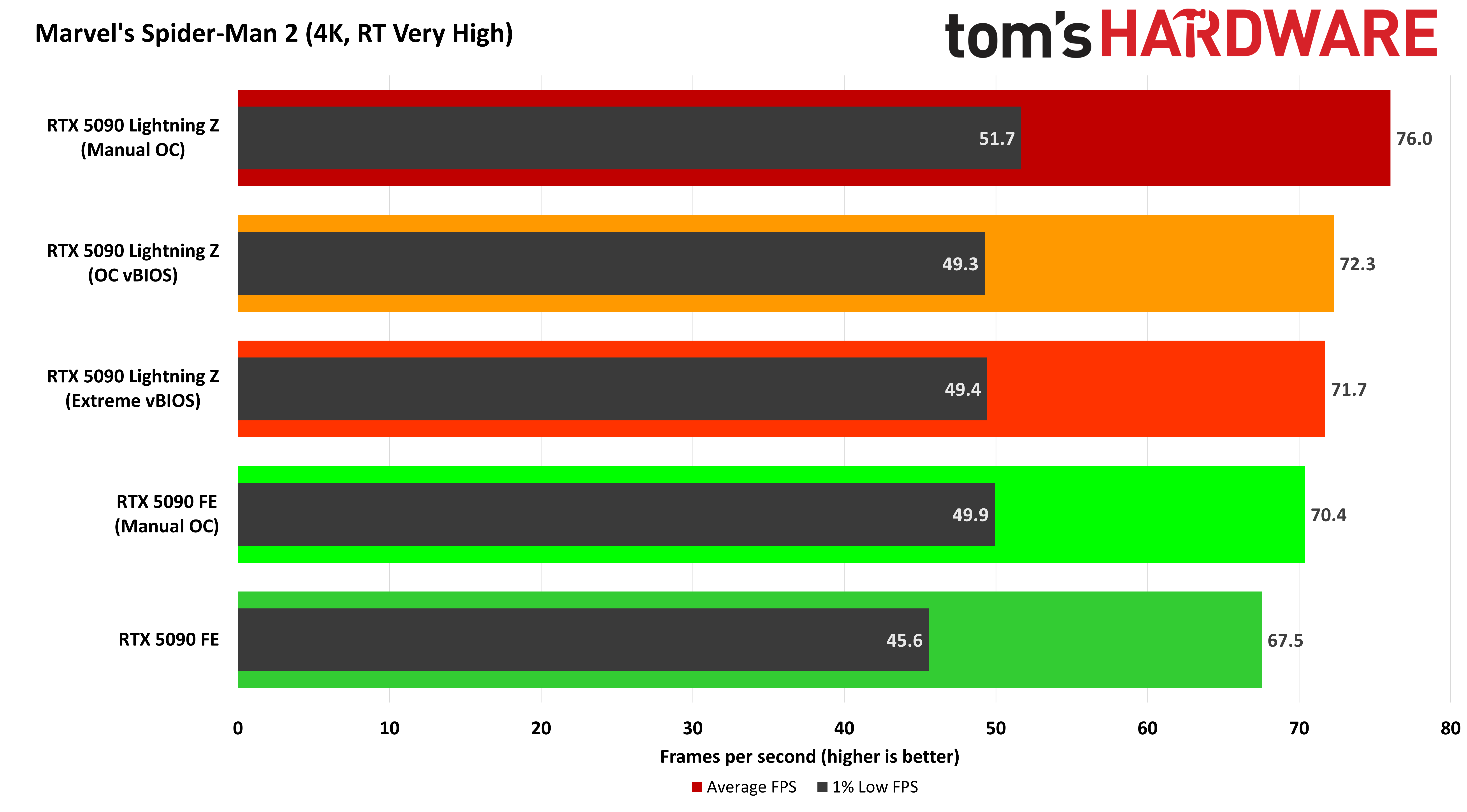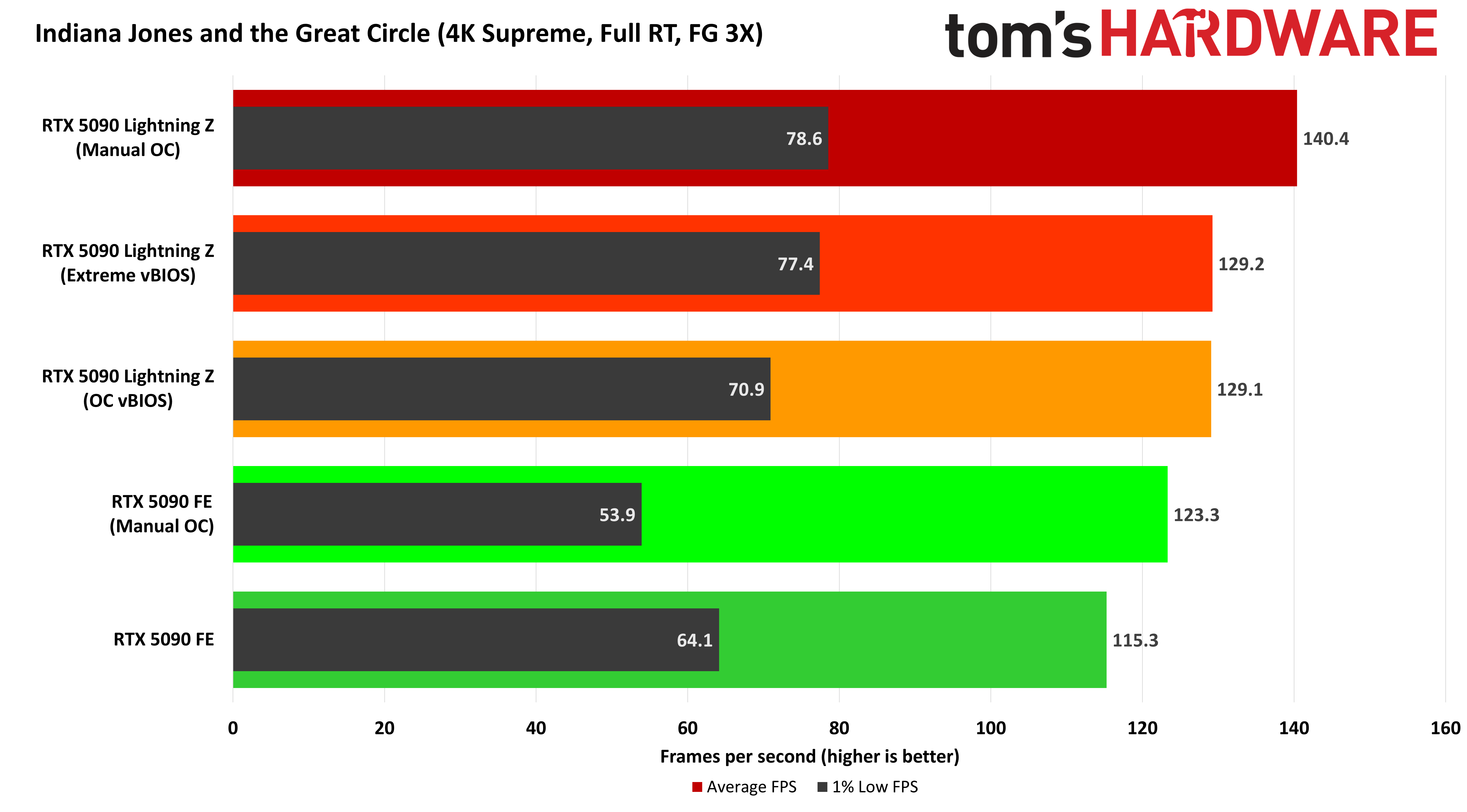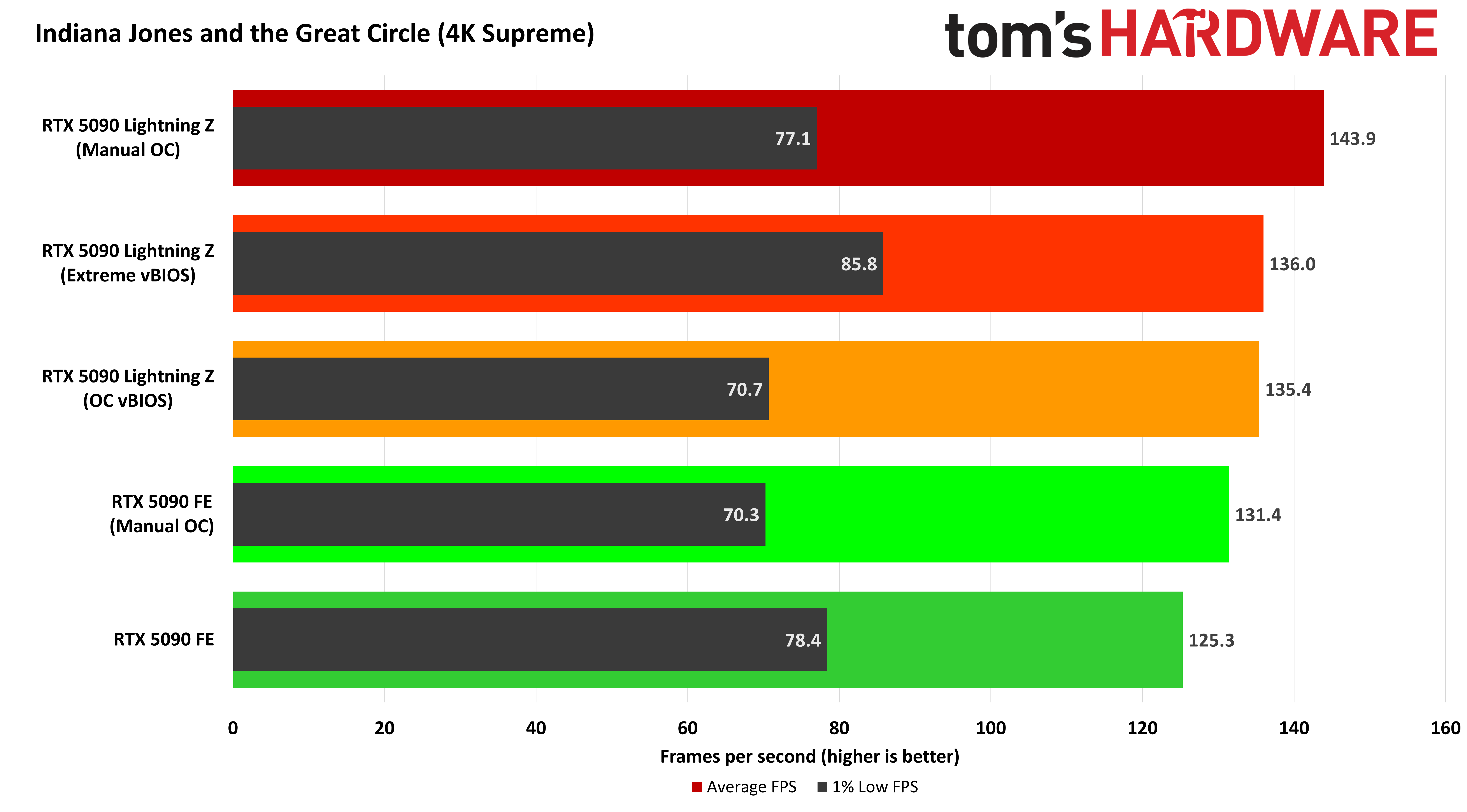 За счет расширенных лимитов мощности и отличного охлаждения производительность из коробки оказалась на 12% выше, чем у RTX 5090 Founders Edition. Если добавить ручной разгон, отрыв вырастает до невероятных 18% (хотя ручной разгон FE немного сократит эту разницу до 10%). В недавнем прошлом ради такого скачка FPS Nvidia выкатила бы отдельную модель с приставкой Ti. Но пока этого не случилось, Lightning Z дает своим владельцам весомое преимущество в играх — и отличный повод похвастаться перед обладателями обычных 5090.