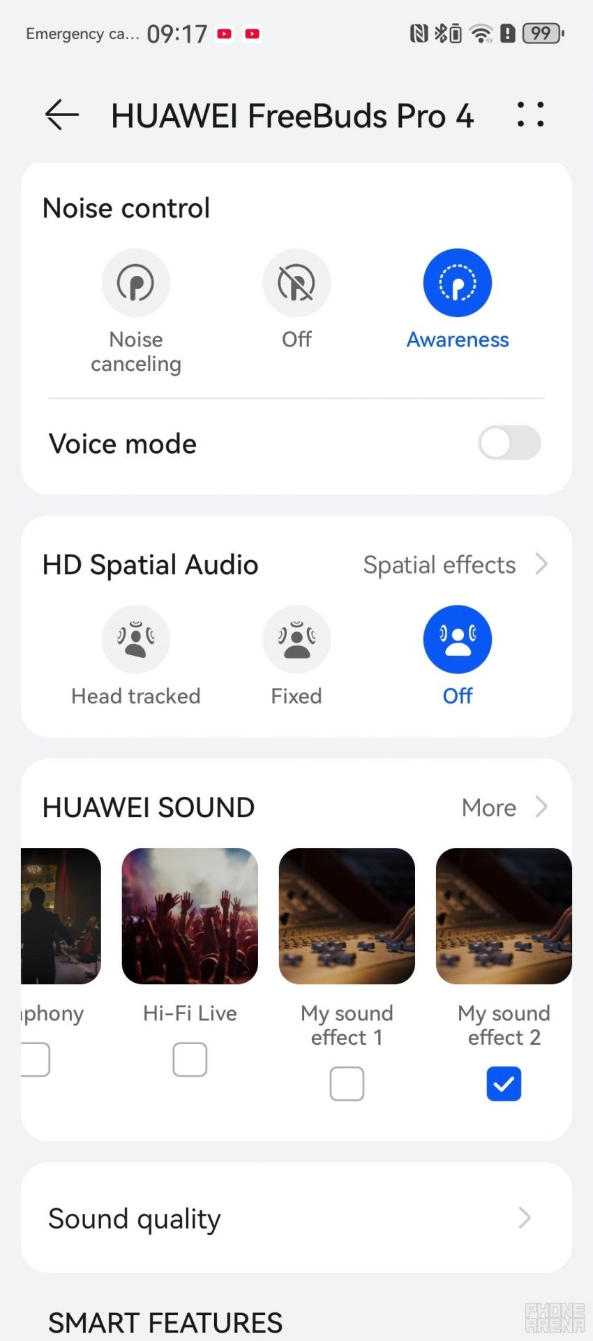 Наушники FreeBuds Pro 4 довольно умные. Если вы надеваете оба наушника, они автоматически переходят в режим шумоподавления. Однако если вы надеваете только один наушник, по умолчанию включается режим Awareness. Я часто гуляю с одним наушником, поэтому мне нужен режим Awareness, когда я на улице. Кроме того, нет смысла активировать шумоподавление, если вы носите только один наушник.
