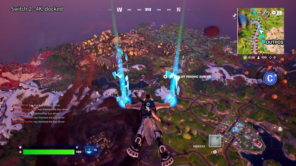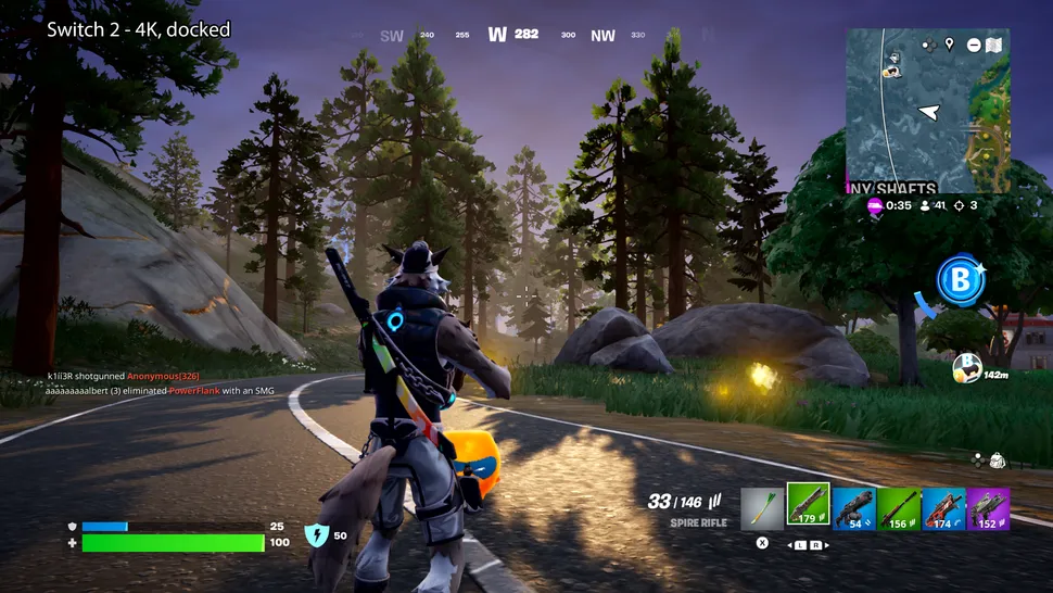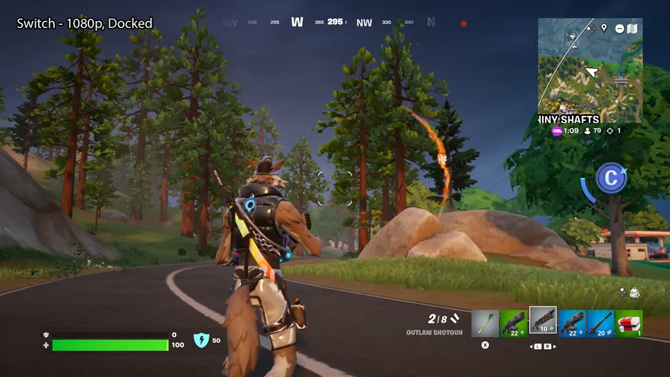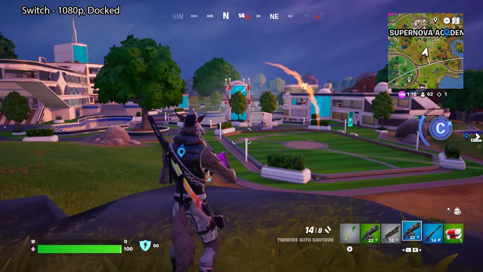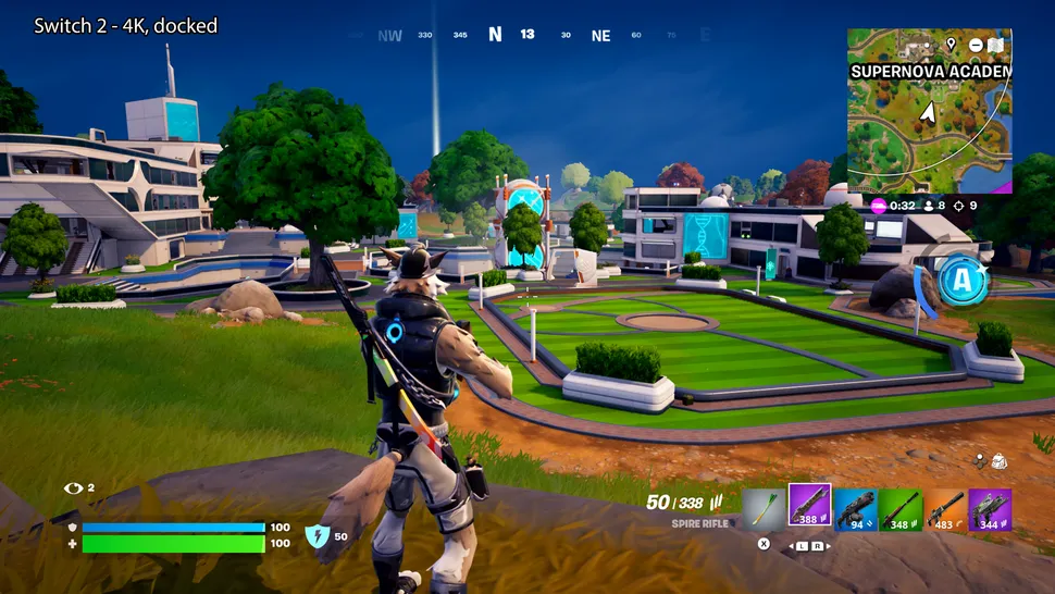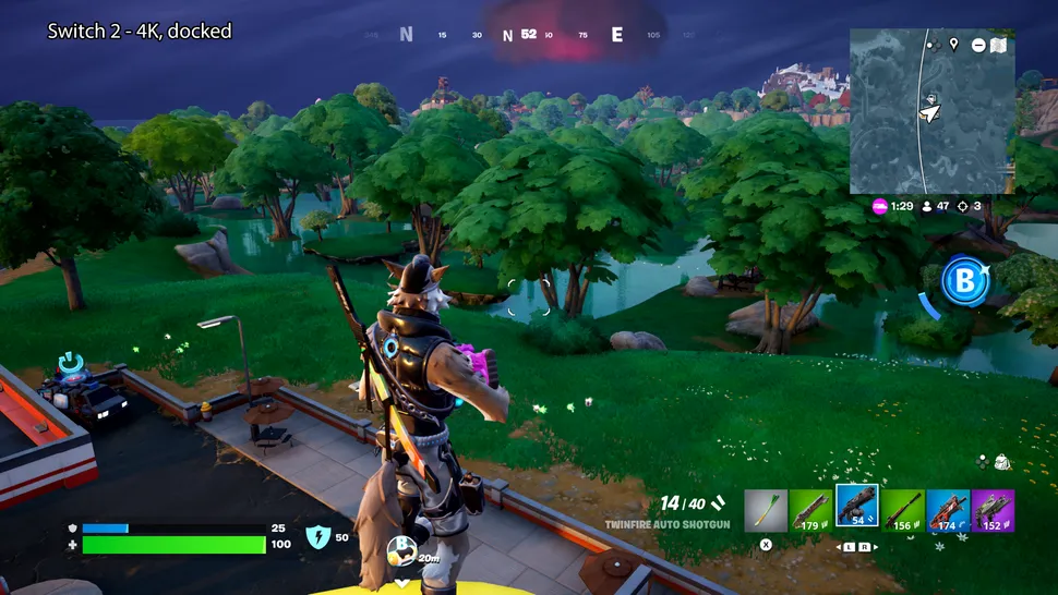 Fortnite на Switch 2 гораздо больше похожа на версию для ПК, которую я предпочитаю, как в док-станции, так и без неё. Epic заявляет, что на Switch 2 частота кадров составляет 60 кадров в секунду, и это соответствует моим ощущениям. С ней приятно взаимодействовать, и она гораздо красивее версии для ПК. Мои любимые скины выглядели чёткими, деревья и листва — более геометрически правильными, а причудливых световых эффектов было предостаточно.