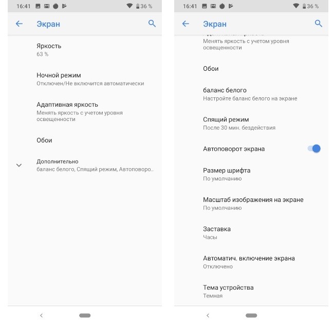 Настройки экрана тоже порадовали. Помимо непременного ночного режима, а также выбора между светлой и темной темой здесь есть настройка цветовой температуры (регулируя баланс белого, можно сделать цвета на экране холоднее или теплее). Еще можно запретить включение экрана при доставке новых уведомлений (полезная опция, если экономите заряд батареи) и настроить включение спящего режима в разных интервалах — от 30 секунд до 30 минут.