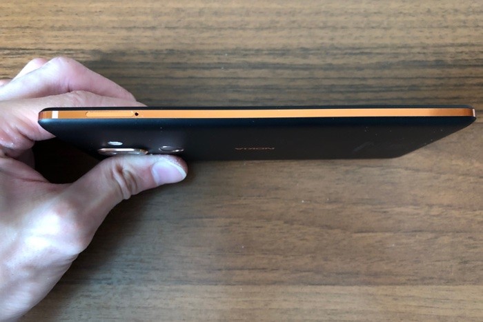 Увы, но дизайн Nokia 7 Plus мне не понравился. В модели черного цвета зачем-то по боковым граням корпуса решили сделать золотые окантовки и выглядят, они, надо сказать, ужасно. Точно такая же золотая окантовка есть вокруг датчика отпечатка пальцев и на камере. Может быть, в Nokia посчитали это решение красивым и хотели подчеркнуть «премиальность» данной модели, но по факту получилось, мягко говоря, спорно.