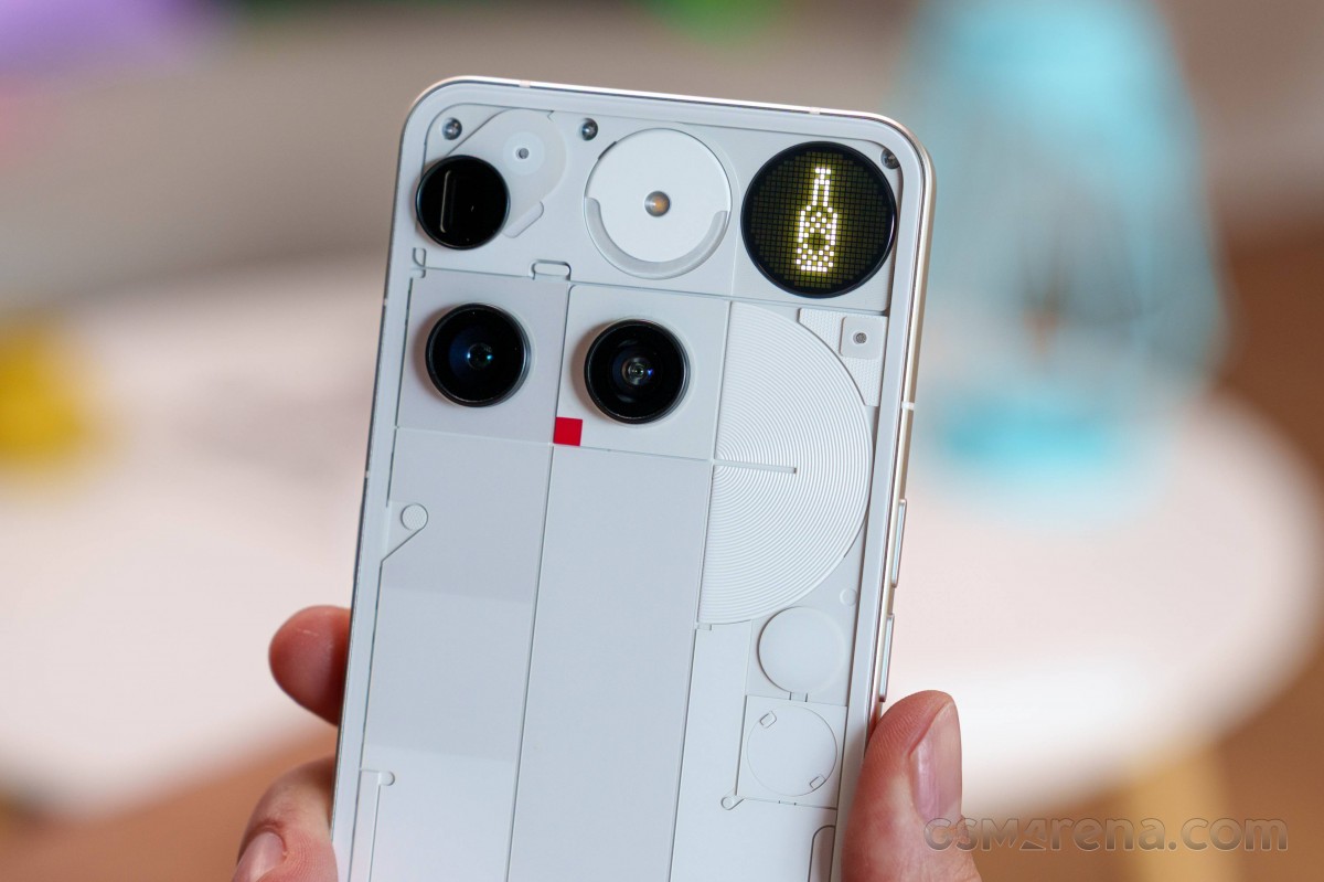 Давайте сначала поговорим о функциональных возможностях. Здесь, конечно, есть камеры и светодиодная вспышка, но исчезли светодиодные полосы с глифами (также известные как интерфейс Glyph). Теперь у вас есть то, что в Nothing называют матрицей Glyph. Фирменный интерфейс Nothing Phone с глифами теперь представляет собой монохромный дисплей с 489 светодиодами.