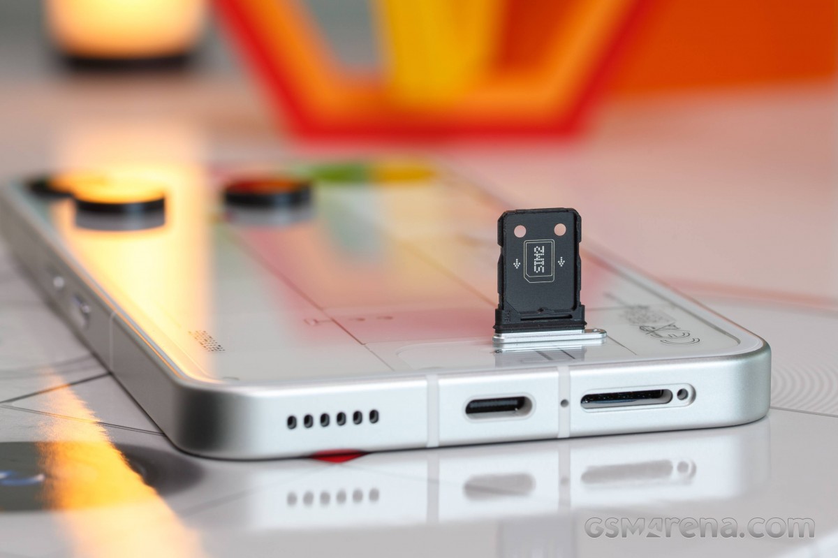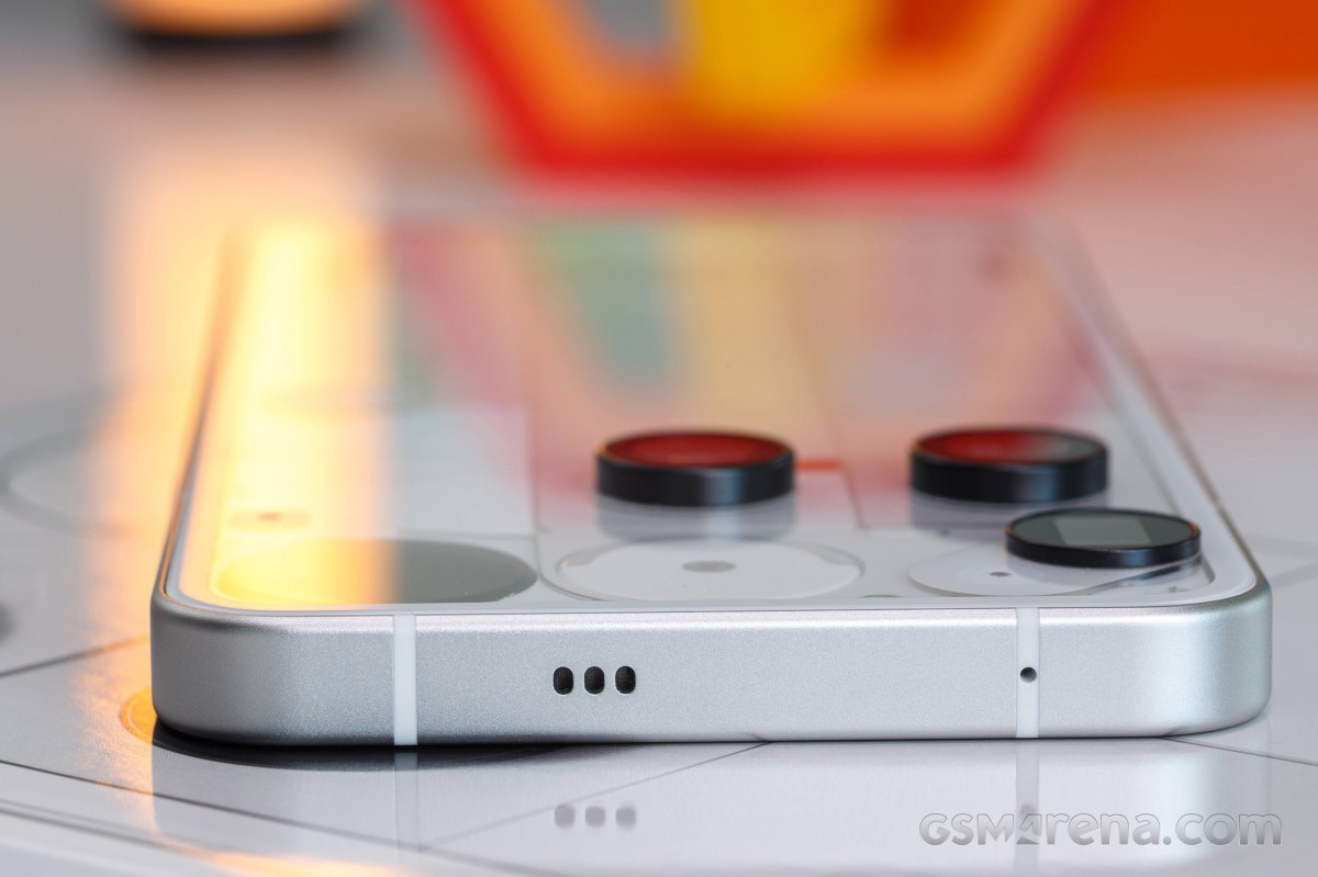Верхняя часть Phone (3) не совсем пустая, и это отличная новость, ведь здесь находится решётка дополнительного динамика. Идея заключается в том, что звук направляется не только вперёд, к экрану, где находится динамик, но и вверх, что делает звук более сбалансированным благодаря специальному нижнему динамику. На нижней части телефона почти ничего нет — только порт Type-C и лоток для двух Nano-SIM. К сожалению, здесь нет возможности расширения памяти.