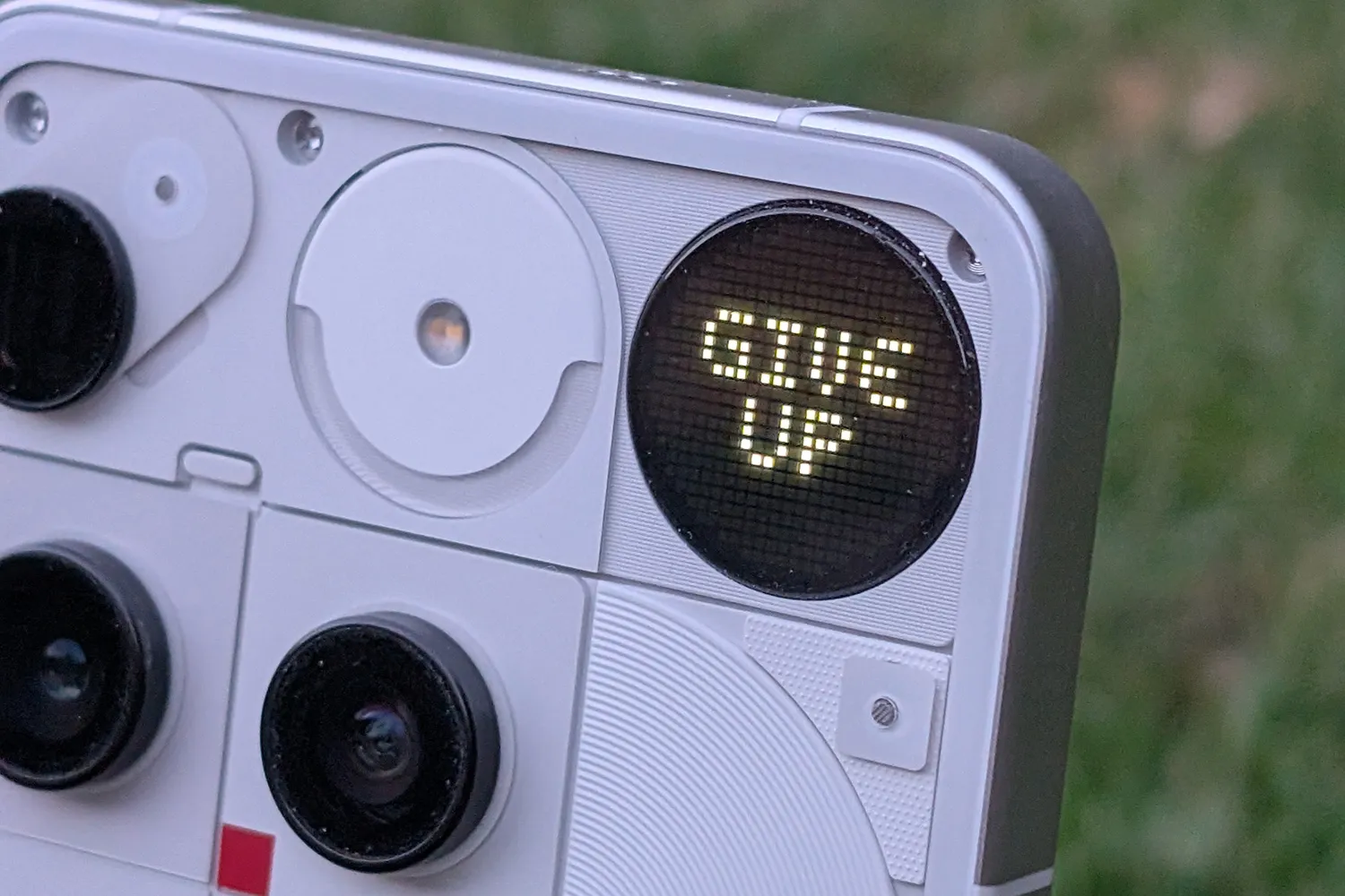 На видном месте находится круглая матричная панель с белыми светодиодами, которые отображают уведомления приложений, когда телефон лежит экраном вниз. Нажмите на сенсорную точку, встроенную в заднюю панель, и вы сможете переключаться между таймерами обратного отсчёта, отображением оставшегося заряда батареи и текущего времени, использовать её в качестве видоискателя для селфи-камеры (хотя делать фотографии в таком стиле невозможно) и играть в несколько мини-игр. То, что среди них есть «бутылочка», должно подсказать вам, на кого нацелен Nothing Phone 3.