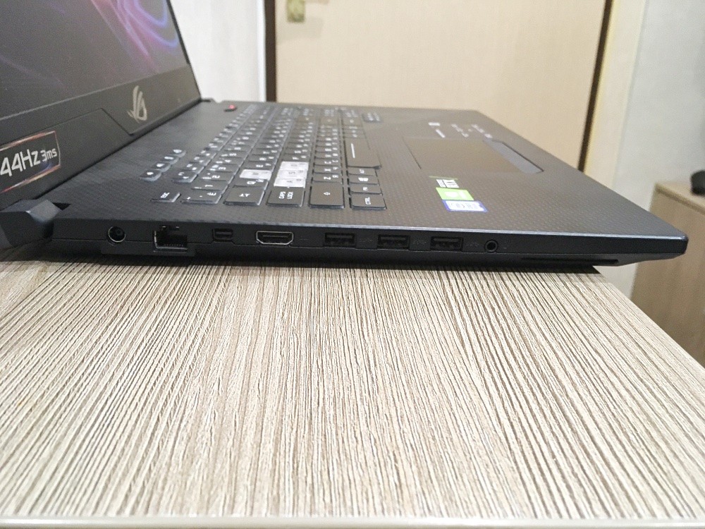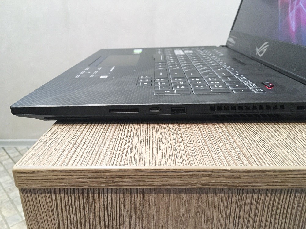 Разъемы и порты расположены по бокам. На левой стороне — коннектор для подключения блока питания, Ethernet-порт, mini-DisplayPort, HDMI, три USB 3.1, 3,5-мм разъем для подключения наушников или гарнитуры. Очень расстраивает и удивляет отсутствие отдельного порта для микрофона. С правой находятся ещё 2 USB-порта, устройство для чтения карт памяти, а также петля для замка Kensington. На центральной стороне — декоративная световая полоска, чья подсветка работает синхронно с клавиатурой.