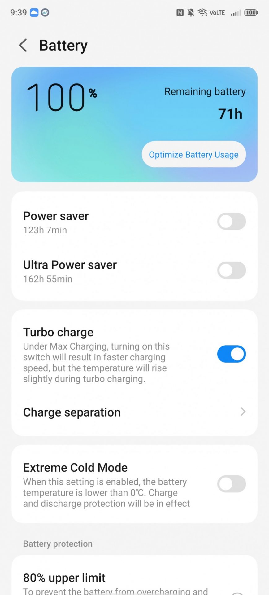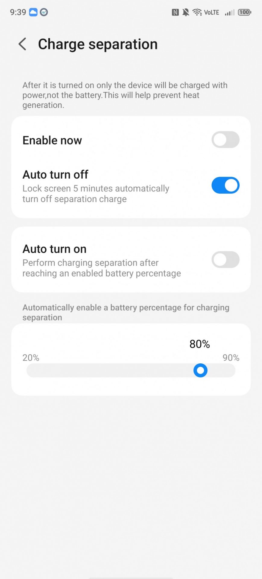 Эта же функция может быть использована для того, чтобы аккумулятор телефона не заряжался выше определенного процента, что потенциально способствует продлению срока службы ячейки. Вы можете установить бесступенчатый ползунок на любое значение от 20% до 90%, и телефон зарядится до этого уровня, а затем перейдет в режим разделения. Есть и более простой путь к аналогичной цели — простой переключатель, который ограничит зарядку до 80%.