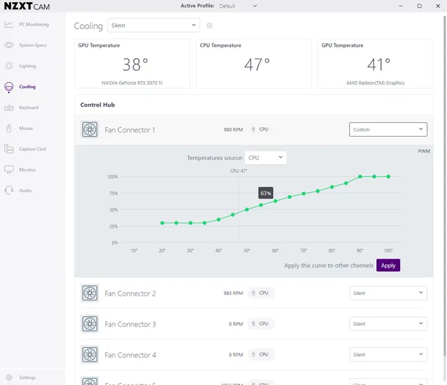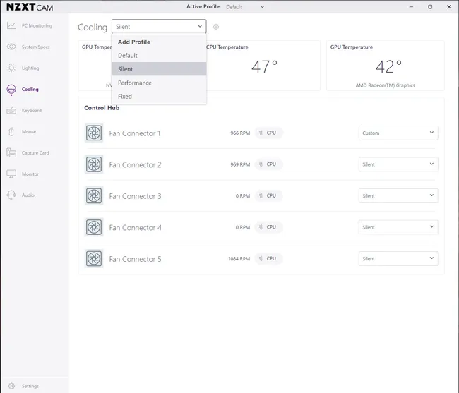 Хорошей новостью является то, что кривые вращения вентилятора можно настроить с помощью приложения NZXT CAM. И, как я объяснял в предыдущем разделе, даже при использовании настройки «Бесшумный вентилятор» разница в нагреве невелика.