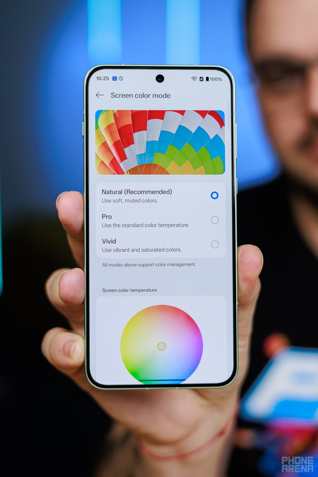 В наших независимых тестах дисплей OnePlus 15R показал отличную пиковую яркость в 3500 нит и достойную минимальную яркость 1,9 нит. Цветовая температура по умолчанию немного отличается от идеальной, но в настройках можно выбрать «Естественный» или «Яркий» профиль, а также включить адаптивный тон.