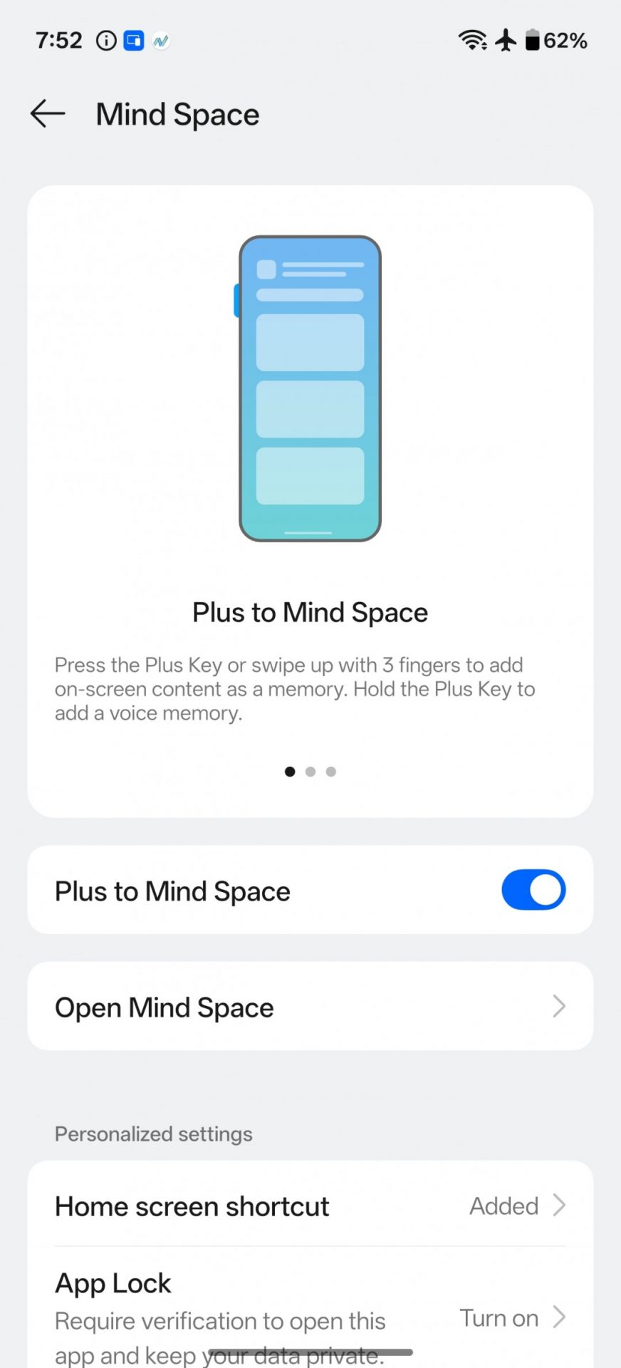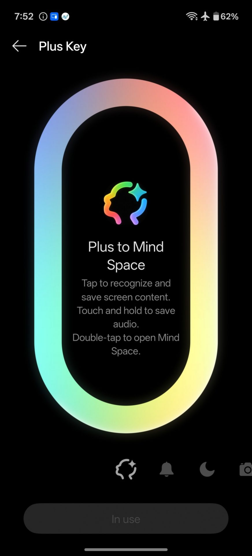 На левой стороне находится кнопка «Плюс» (Plus Button) — аналог кнопки Action у Apple. Ее можно запрограммировать на создание скриншота, запись голосовых заметок, перевод текста, управление фонариком, запуск камеры, переключение режима «Не беспокоить» или беззвучного режима, а также на сохранение звукового скриншота через функцию Mind Space.