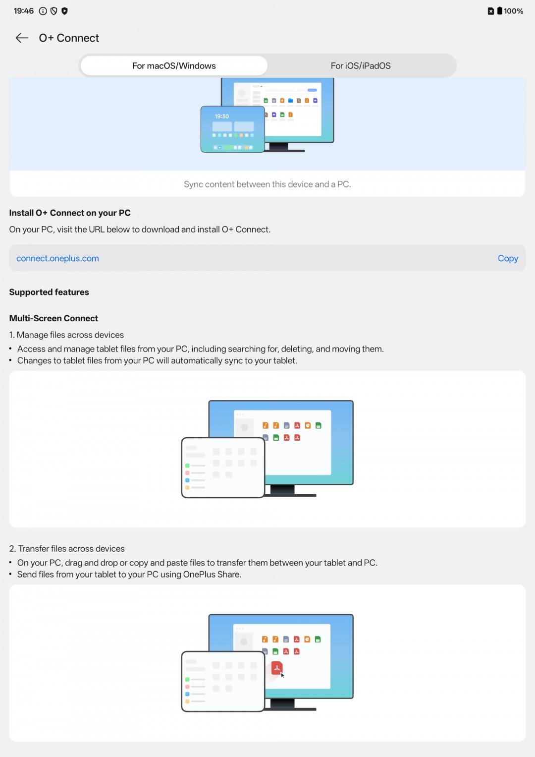 Еще одна впечатляющая программная особенность Pad Go 2 — приложение O+ Connect. Оно позволяет подключаться к компьютеру на Mac или Windows и управлять им удаленно. Процедура настройки проста: нужно скачать приложение O+ Connect и установить его на ПК. Существует даже версия для Mac с процессорами Intel. После настройки вы можете зайти в меню «Удаленное управление ПК» в настройках Pad Go 2 и выполнить сопряжение устройств.