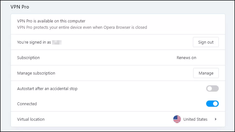 Единственная другая функция — это значок Settings (Настройки). Нажатие на него открывает раздел VPN Pro на странице общих настроек Opera. Он еще более прост, чем список местоположений, и содержит не более пары опций управления учетной записью и функцию повторного подключения (которая автоматически перезапускается, если VPN не работает).