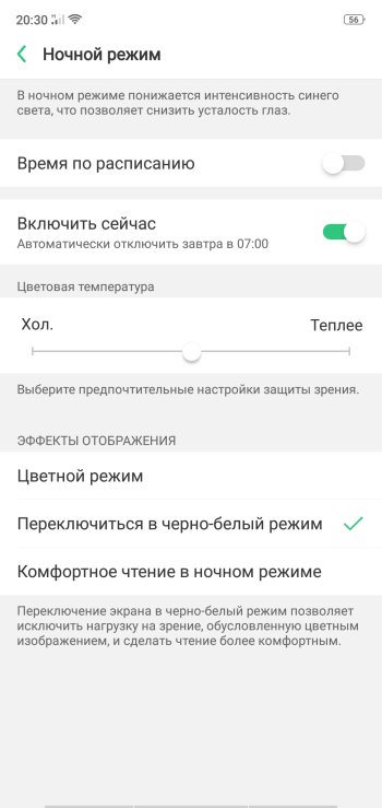 Зато OPPO F7 отлично кастомизируется в ночном режиме (или режиме защиты зрения). Можно не только снизить синеву, но и переключиться в черно-белые режимы, еще больше снижающие нагрузку для глаза при чтении с экрана.