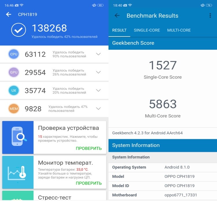 В синтетических тестах смартфон показывает вполне достойные результаты, да и в обычной жизни не подводит: за месяц использования OPPO F7 ни разу не завис, не тупил и вообще всячески радовал четкостью работы. В стресс-тестах смартфон также вел себя примерно и почти не нагревался.