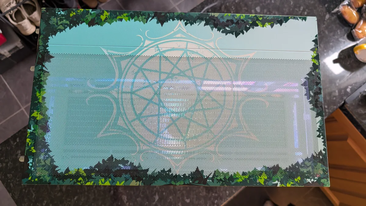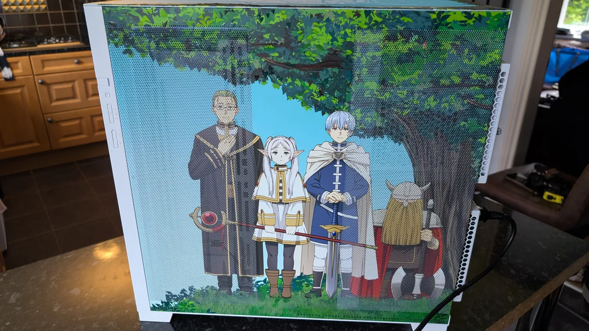 Если не брать в расчёт размер, то это, безусловно, очень красивая система. Качество прорисовки превосходное, и принт в стиле аниме нанесён не только на стеклянные панели. На металлической панели с противоположной стороны есть отдельный рисунок, изображающий предыдущее приключение Фриерен (показанное в воспоминаниях в сериале, которые являются важной частью её развития как персонажа — ладно, я сейчас замолчу), а также большая печать на верхней решётке. Он также оснащён множеством полностью настраиваемых RGB-подсветок, в том числе двумя тонкими световыми полосами, которые проходят по верхнему и нижнему краям панели. На задней панели, как и положено игровому ПК, имеется множество портов, а на передней панели — довольно стандартный набор портов ввода-вывода: USB-A, USB-C и аудиоразъём.