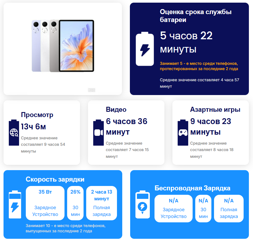Honor Pad V9 оснащён довольно ёмким аккумулятором, особенно если учесть его размер и вес. Аккумулятор ёмкостью 10100 мАч изготовлен из углеродного кремния — Honor стала первой компанией, предложившей эту технологию за пределами Китая в модели Magic 6 Pro. Для получения дополнительной информации ознакомьтесь с нашей специальной статьёй на эту тему.