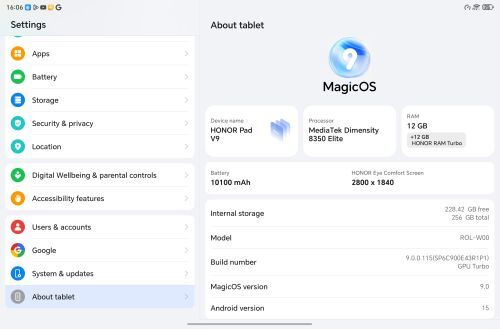 Если говорить об искусственном интеллекте, то Gemini доступен, если вы удерживаете нажатой кнопку питания в течение длительного времени, так что у вас есть возможность использовать систему искусственного интеллекта Google, если вам так хочется. На выставке MWC в Барселоне в этом году компания Honor поделилась своими смелыми планами по предоставлению семилетних обновлений программного обеспечения, но мы сомневаемся, что это обещание распространяется на планшеты среднего класса, такие как Pad V9. Модель Pad 9, выпущенная в прошлом году, получила только одно крупное обновление ОС и будет поддерживаться с помощью исправлений безопасности в течение трёх лет, и то же самое относится к Pad V9.
