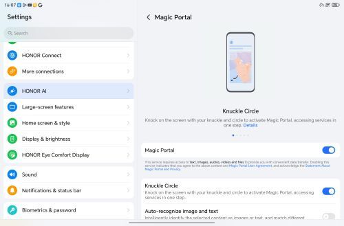 В приложении есть функция Magic Portal, которая позволяет выделить текст или изображение и перетащить их на край планшета, где откроется панель с множеством приложений. Вы можете экспортировать выделенный фрагмент прямо в эти приложения. Компания Honor продолжает работать над приложением Notes, и в нём также есть некоторые функции искусственного интеллекта. Вы можете обобщить текст, записать или импортировать аудиофайл и попросить Notes создать обобщение на основе характера записи — брифинг для СМИ, интервью, тренинг и т. д.