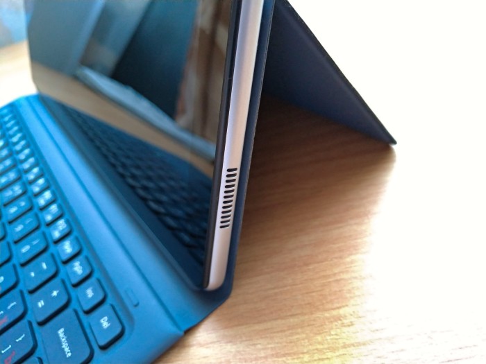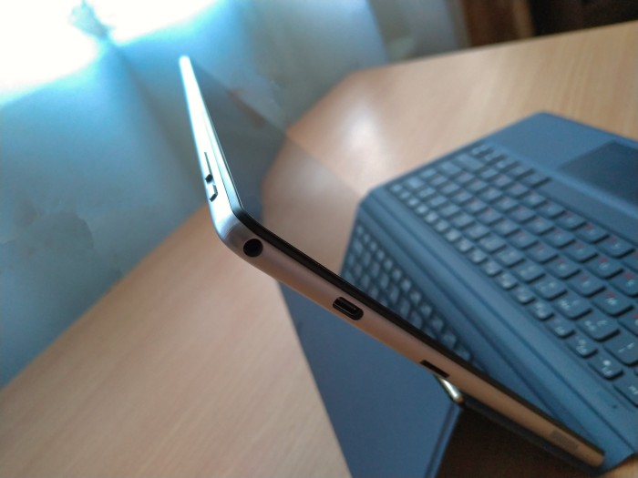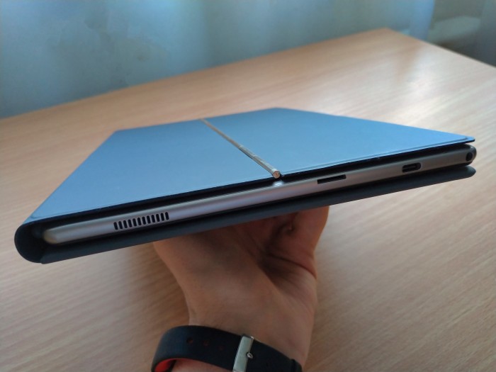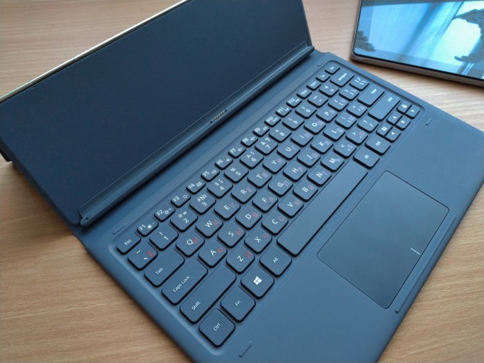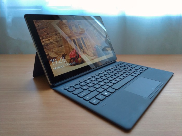 Клавиатура имеет трекпад с двумя кнопками, но пользоваться им, честно говоря, тяжело, так как присутствует задержка, и в данном случае сенсорный экран справляется намного лучше. Зато ход клавиш на клавиатуре полноценный, нажатия хорошо ощущаются, и печатать на ней определенно приятно. На части обложки, прикрывающей спинку устройства, есть откидываемая часть, так называемая ножка, которая позволяет зафиксировать устройство на горизонтальной поверхности подобно ноутбуку. Ножка эта имеет туговатый ход, но качество ее сборки, да и вообще клавиатуры-обложки в целом, не вызывает нареканий.