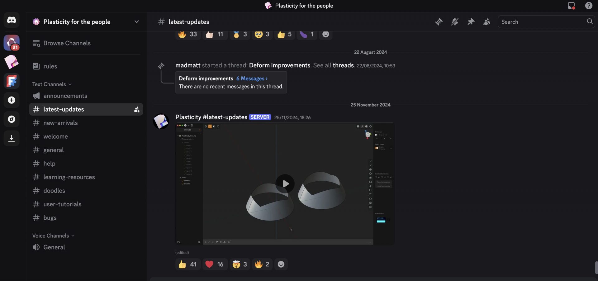 Последний элемент поддержки — официальный сервер Plasticity в Discord. Здесь пользователи, как с бесплатной пробной версией, так и с лицензией, могут задавать вопросы, получать помощь от других членов сообщества и разработчика, сообщать об ошибках и вносить предложения по функциям. Также есть отдельный приватный канал специально для платных пользователей, где они могут сообщать об ошибках.