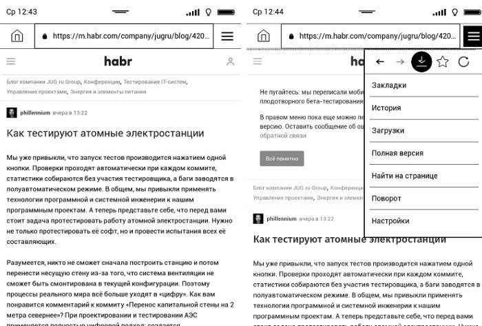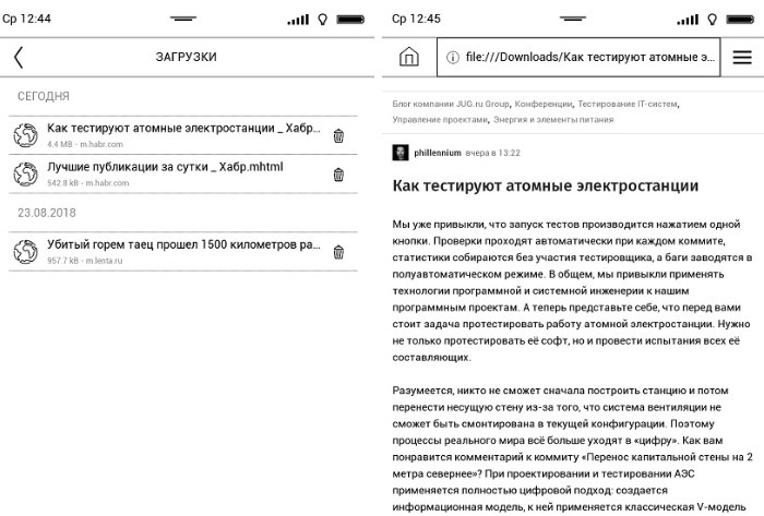 На нажатия экран реагирует адекватно — во время тестирования ридер чутко откликался на каждое прикосновение. Поддерживается мультитач — размер шрифта в книге или масштаб сайтов можно менять разведением или сведением пальцев.
