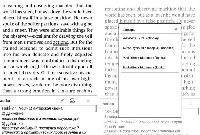 По-прежнему радуют предустановленные словари в количестве четырех штук, которые очень пригодятся при чтении иностранной литературы. Можно просто выделить пальцем незнакомое иностранное слово и тут же получить его перевод.