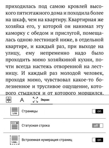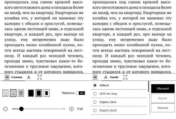 Для текста в PocketBook 627 предусмотрен широчайший выбор настроек: размер и тип шрифта, поля, расстояние между строками, переносы, отступы и так далее.