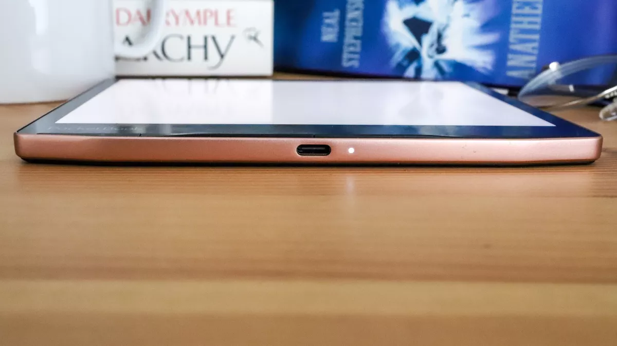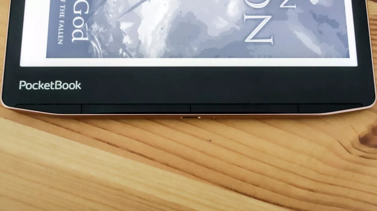 В отличие от большинства других электронных книг, PocketBook Era имеет встроенный динамик, который вы увидите на нижней части устройства в виде перфорации на металлической окантовке… в точности как у смартфона. Сбоку на широкой рамке расположен порт для зарядки USB-C и крошечный световой индикатор, который загорается, когда Era выполняет ту или иную функцию, а также во время зарядки.