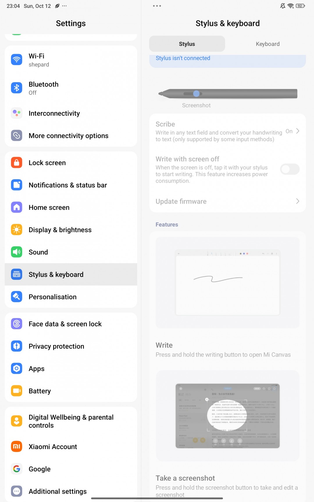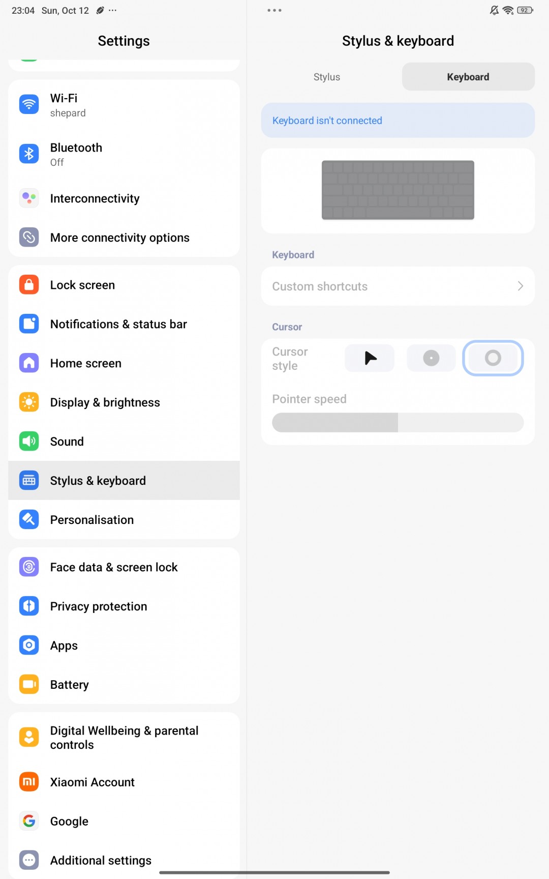 Если вы докупили фирменные аксессуары, загляните в меню «Стилус и клавиатура». Для чехла-клавиатуры Poco Pad M1 там доступно множество настроек, включая полезные сочетания клавиш и выбор стиля курсора.