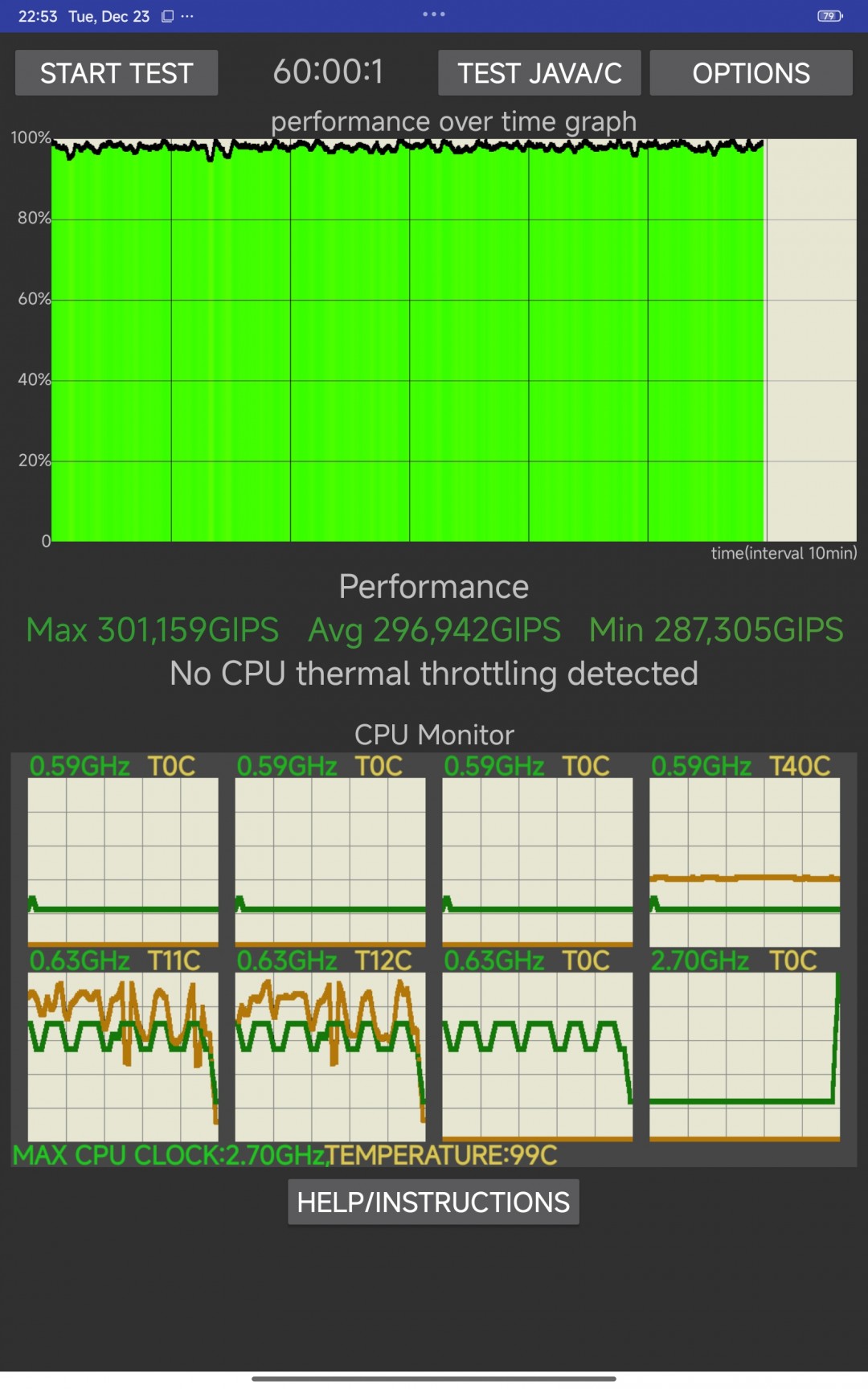 В завершение мы провели стандартные стресс-тесты Poco Pad M1 (тестирование стабильности CPU и GPU). Результаты оказались превосходными — устройство совершенно не сбрасывает частоты под длительной нагрузкой (троттлинг отсутствует).