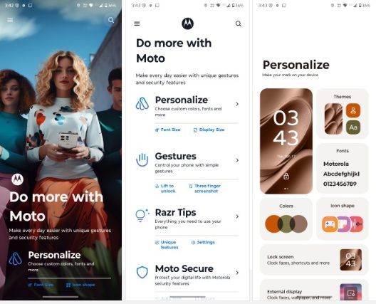 Шрифт выделяет приложения Moto на фоне других стандартных элементов пользовательского интерфейса, в то время как дополнительные функции находятся в обычном центре приложений Moto. Недавно был проведён редизайн, и теперь всё организовано более аккуратно — например, категории с большим количеством записей, такие как «Жесты», теперь умещаются на одной странице.