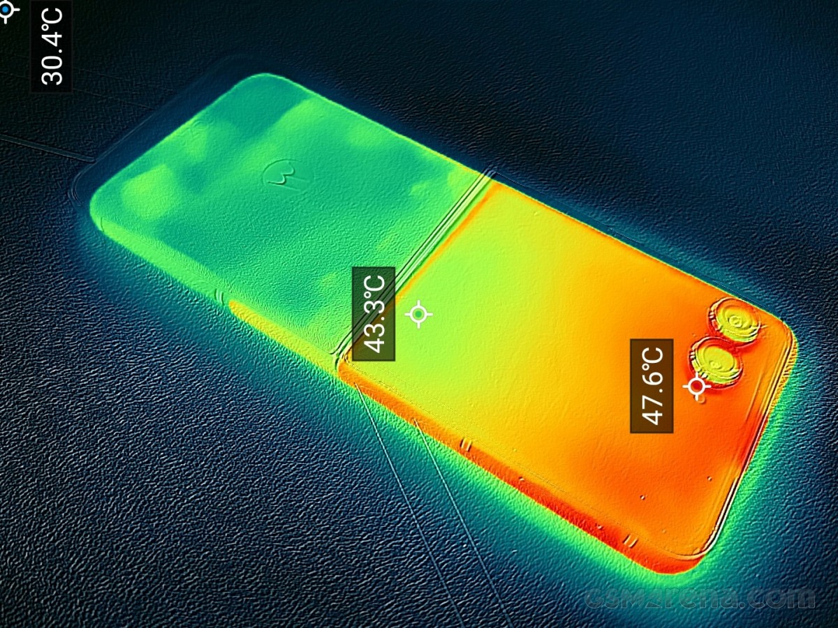 Температура поверхности при длительной нагрузке достигала примерно 48 градусов, что не очень хорошо, но и не так уж плохо. К тому же горячие точки были локализованы и находились вдали от тех мест, к которым вы будете прикасаться.