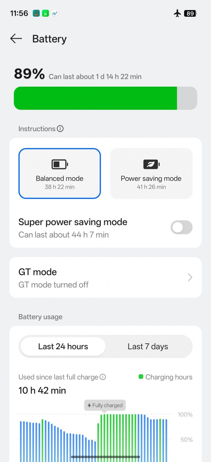 Поскольку Realme заявляет о поддержке 55-ваттной зарядки через совместимые адаптеры USB Power Delivery, мы протестировали и этот сценарий. Неудивительно, что телефон достиг пиковой мощности 40–43 Вт, но удерживал её дольше, чем при использовании фирменного блока. Это объясняет, почему в первые 15–30 минут показатели были схожими, но общее время зарядки оказалось больше — более полутора часов.